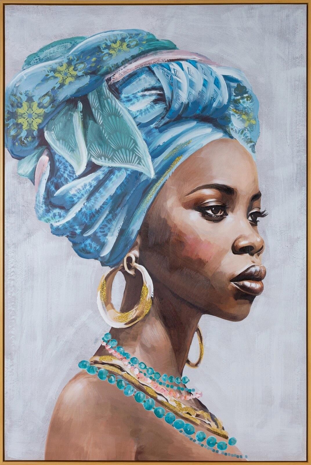 Jeśli poszukujesz oryginalnej i nowoczesnej dekoracji wnętrza polecamy ręcznie malowany na płótnie obraz przedstawiający portret ciemnoskórej kobiety z turbanem na głowie i spokojnych barwach. Taki dodatek będzie świetnym dopełnieniem przestrzeni gabinetu kosmetycznego, wnętrza sklepu czy domowej aranżacji w stylu etno czy boho.