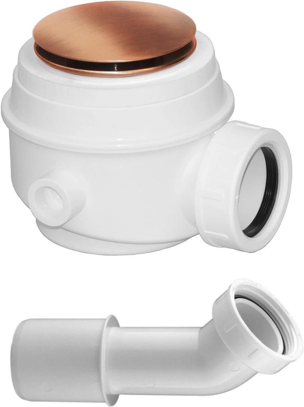 Syfon brodzikowo-wannowy, do brodzików z otworem 50 mm i wanien bez przelewu. Wymiary 7,5 cm / ø 5 cm. Mechanizm klik-klak. W zestawie kolano redukcyjne. Wydajność odpływu 24 l/min. Odejście 4-5 cm, czyszczony od góry, pokrywa mosiężna. Wykończenie: miedź szczotkowana