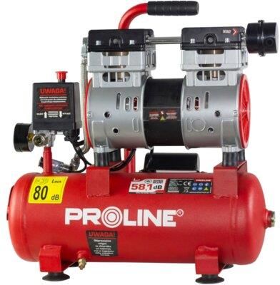 Kompresor bezolejowy PROLINE P200006 z silnikiem o mocy 750 W z wentylatorem chłodzącym i automatyczną ochroną przed przegrzaniem. Wydajność 124 l/min. Pojemność zbiornika 9l.