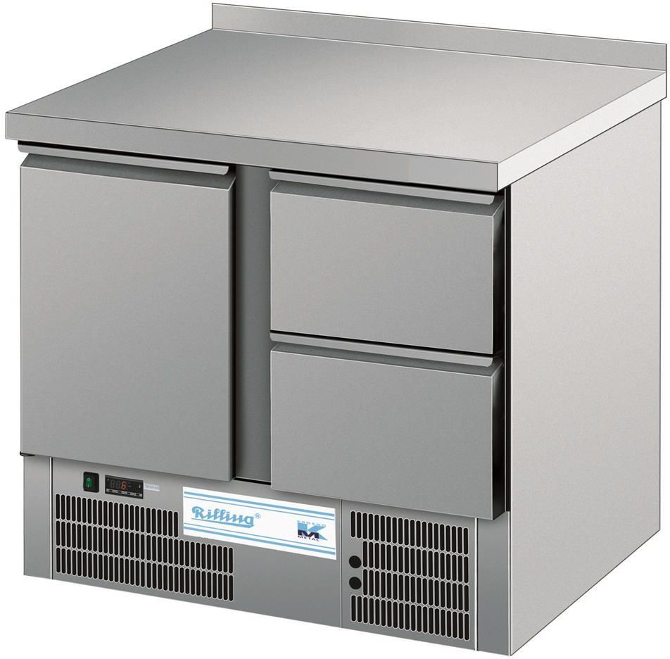 Stół chłodniczy dla GN 1/1, 1 drzwi skrzydłowe i 2 szuflady o wysokości użytkowej 152 mm, blat zagięty w górę na 50 mm (typ C), parownik zapianowany w tylnej ścianie, wymuszony obieg powietrza, automatyczne odszranianie i odparowanie kondensatu, elektroniczny sterownik. Gotowy do podłączenia. …