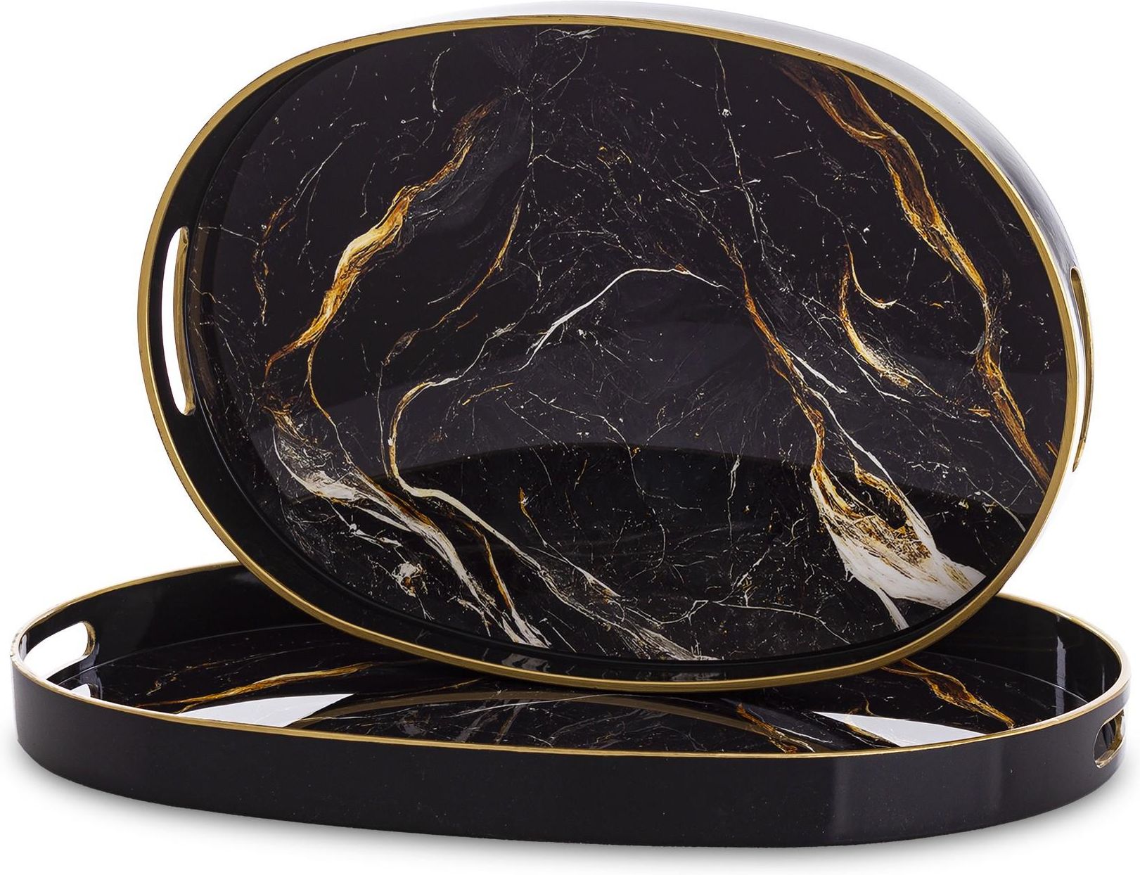 Taca Dekoracyjna Kpl.2 Szt. Szkatułki, Ramki i Tace / Tace Tulum Rozmiar: 3,5x44x29,5 3,5x39,5x27 Pakowanie: 8/1 Waga: 1.96 kg Materiał: tworzywo sztuczne Kolor: czarny, złoty