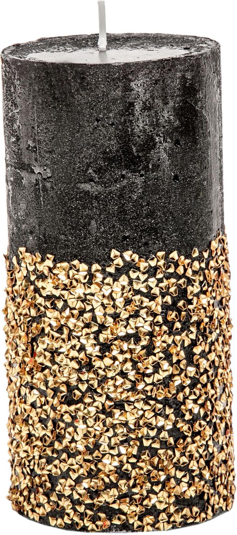 Ozdobna, czarna świeca to subtelne zwieńczenie eleganckiej aranżacji wnętrza. Zdobiona złotymi szkiełkami stanowi doskonałą dekorację za dnia, natomiast wieczorem, zapalona, wprowadzi do salonu lub sypialni kameralny, romantyczny nastrój. Postaw ją na specjalnej podstawce lub w eleganckim szklanym świeczniku - kloszu; Złote błyszczące drobinki nadają świecy charakter glamour; Świeca dostępna jest w 2 wielkościach: 8 cm i 14 cm.