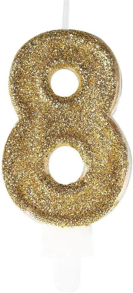 Kunsztowna świeczka w kształcie cyfry 8 Te ekskluzywne, przyozdobione brokatem świeczki w formie cyfry 8 są dostarczane na eleganckiej podstawce. Wysokość tego dekoracyjnego dodatku wynosi 7,5 cm i jest dostępna w dwóch kosmopolitycznych odcieniach: złotym i srebrnym. EAN: 5902934220392