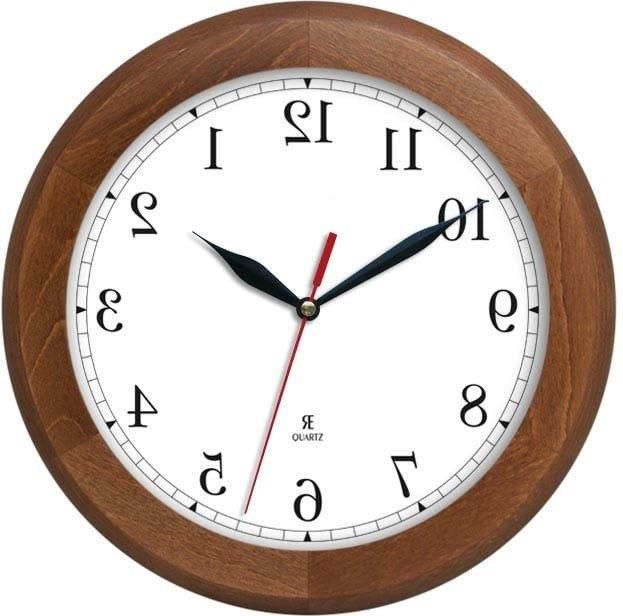 Drewniany zegar ścienny z mechanizmem wstecznym, chodzącym do tyłu - wskazówki zegara poruszają się w lewą stronę. Anty zegar. Cyfry w odbiciu lustrzanym. Mechanizm kwarcowy tykający. Średnica 30 cm. Model ACW301AL2 CD LU