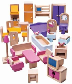 Mebelki do domku dla lalek 27 elementów Bigjigs 3+ Piękny zestaw drewnianych mebli do umeblowania domku dla lalek. Skład zestawu meble wypoczynkowe do salonu (kanapa, fotele)m, szafka, telewizor, lampka meble do sypialni: łóżko, szafa, szafki wyposażenie łazienki - wanna, sedes, umywalka kuchnia: …