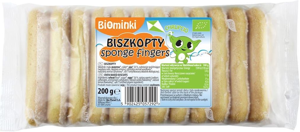 Opis produktu Biszkopty BIO Biominki to wyjątkowa propozycja dla ceniących naturalne i ekologiczne przekąski. Delikatne i puszyste, idealnie komponują się z poranną kawą, popołudniową herbatą lub jako baza do deserów dla całej rodziny. Wyprodukowane z certyfikowanych składników ekologicznych, w tym mąki pszennej i jaj, bez zbędnych dodatków. Ich subtelny smak wanilii i cytryny pochodzący z naturalnych aromatów sprawia, że każda chwila z tymi ekologicznymi biszkoptami to prawdziwa przyjemność. Produkty marki BIOMINKI to gwarancja najwyższej jakości i dbałości o środowisko naturalne. Wartości odżywcze Wartość energetyczna 1599 kJ / 378 kcal Tłuszcz 3,8 g w tym nasycone kwasy tłuszczowe 1,1 g Węglowodany 77 g w tym cukry 42 g Białko 8,5 g Błonnik Sól 0,25 g Składniki Starannie wyselekcjonowane składniki pochodzące z upraw ekologicznych gwarantują wysoką jakość produktu. W skład biszkoptów wchodzą: mąka PSZENNA*, cukier*, JAJA* 26 %, substancje spulchniające (węglany sodu, węglany amonu), naturalny aromat waniliowy*, naturalny aromat cytrynowy*, sól (*certyfikowany składnik ekologiczny). Alergeny Produkt zawiera pszenicę (gluten) i jaja. Może zawierać soję. Warunki przechowywania Przechowywać w suchym i chłodnym miejscu. Nie wystawiać na działanie promieni słonecznych. Masa netto 200 g Kraj pochodzenia Rolnictwo UE