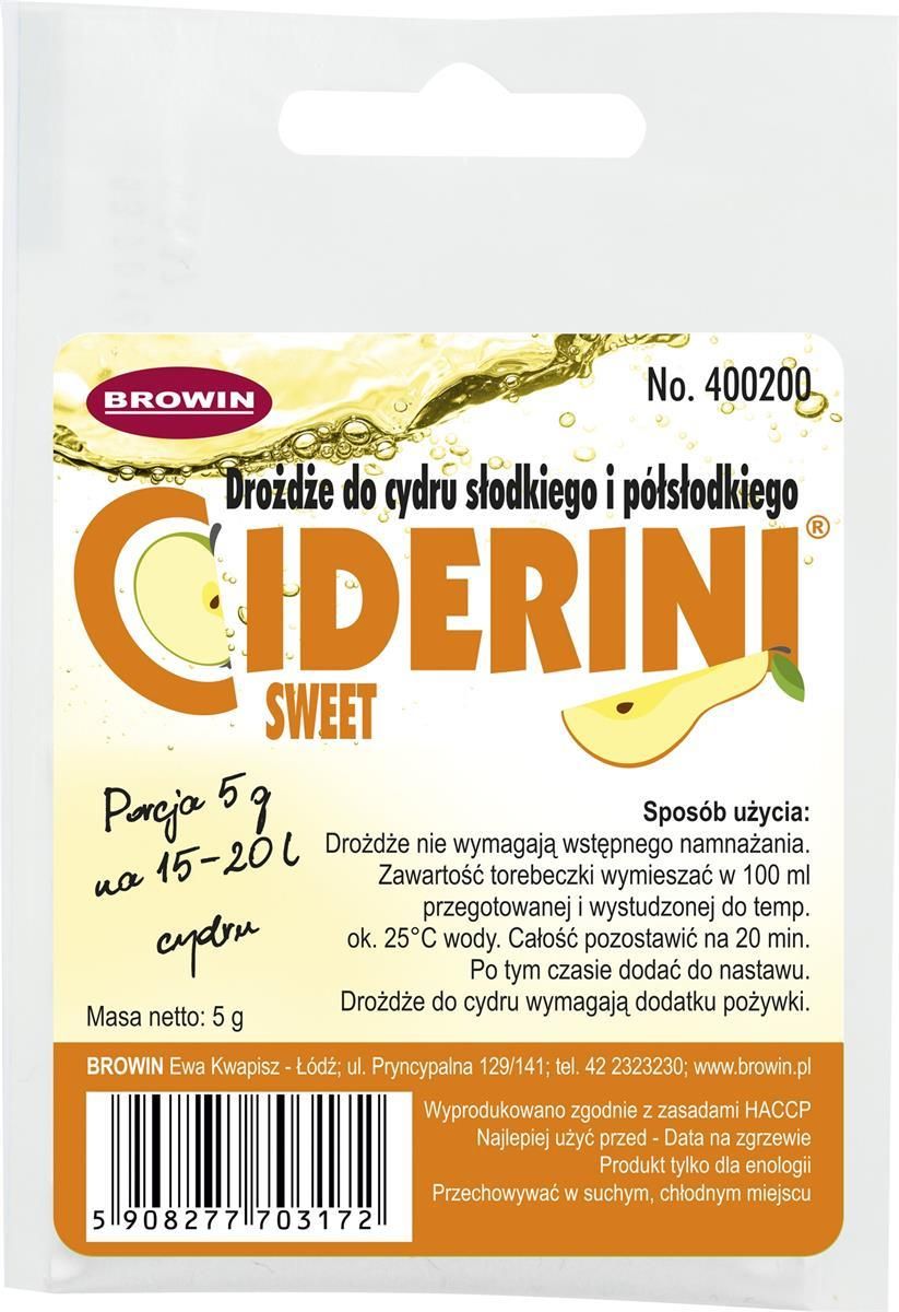 Drożdże cydrowe Ciderini Sweet, 5 g Browin Drożdże cydrowe Ciderini Sweet, 5 g Niezastąpione w cydrownictwie - Ciderini Sweet to specjalnie wyselekcjonowany szczep drożdży cydrowych. Pozwala na wydobycie z owoców optymalnej ilości aromatów i przygotowanie domowego cydru o wspaniałym smaku. Do cydru …