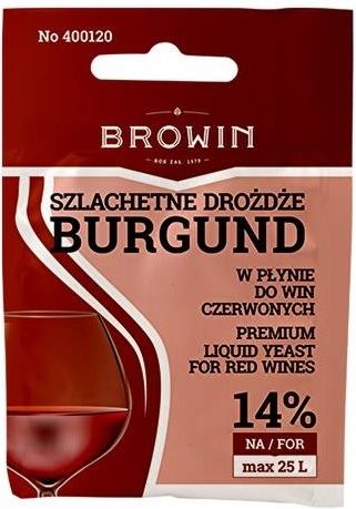 Szlachetne drożdże winiarskie w płynie - do win czerwonych - do 14% alk., 20 ml.​Domowe wina do 14% - drożdże zapewniają dobre odfermentowanie, trwałą barwę i atrakcyjny bukiet.Idealne do win czerwonych - z ciemnych winogron, aronii, jeżyn, porzeczek, czarnego bzu itp.Szybka i stabilna fermentacja - w szerokim zakresie temperatur 20-30C.Wydajne - 20 ml płynnych drożdży pozwala na przygotowanie od 5 do 25 L nastawu.Pełnia możliwości - przy zastosowaniu pożywek dostępnych w naszej ofercie.Zaczynasz przygodę z domowym winiarstwem? Chcesz cieszyć się aromatycznym i pełnym w smaku czerwonym winem o pięknej barwie? Lubisz wybierać wysokiej jakości produkty? Poznaj nasze drożdże winiarskie Burgund - specjalnie wyselekcjonowany szczep szlachetnych drożdży winiarskich Saccharomyces cerevisiae, zawieszonych w płynie ochronnym. Polecane do win czerwonych - zwłaszcza z czereśni, wiśni, malin, śliwek renklod i węgierek, aronii, jeżyn, czarnych i czerwonych porzeczek, czarnych winogron, czarnych jagód, tarniny, czarnego bzu. Drożdże te zapewniają szybką i stabilną fermentację w szerokim zakresie temperatur (20-30C), dobre odfermentowanie cukrów, trwałą barwę wina i atrakcyjny bukiet. Wykorzystując podczas produkcji domowego wina pożywki dostępne w naszej ofercie zapewnisz drożdżom pełnię możliwości, dzięki której Twoje domowe wina będą zachwycać wszystkich Twoich bliskich pełnią smaku, aromatu i barwy!Istotne cechy:- drożdże w płynie- opakowanie 20 ml na 5-25 L- temperatura fermentacji: 20-30C- alkohol: do 14%- pełnia możliwości - przy zastosowaniu pożywek: z witaminą B1 i Kombi VitaSposób użyciaDrożdże w płynie należy wstępnie namnożyć, czyli przygotować szczepionkę drożdży - tak zwaną matkę drożdżową. Do butelki o pojemności 1 L wlej 150 ml soku lub włóż 200 g rozdrobnionych owoców, 300 ml wody i dodaj 2 łyżeczki cukru. Butelkę zakryj czopem z waty i pasteryzuj przez 30 min. Po wystudzeniu do butelki wlej zawartość wstrząśniętej uprzednio torebeczki drożdży. Całość pozostaw na 1-2 doby w temp. 22-26C, po czym wlej do pojemnika fermentacyjnego lub balonu z nastawem wina (5-25 L).UWAGA: we wszystkich etapach przygotowania szczepionki drożdży zachowaj sterylne warunki - szczególną uwagę zwróć na czystość naczynia, w którym będziesz namnażać drożdże.Składniki: : brzeczka słodowa, kultura drożdży winiarskich Saccharomyces cerevisiae, sole mineralne.
