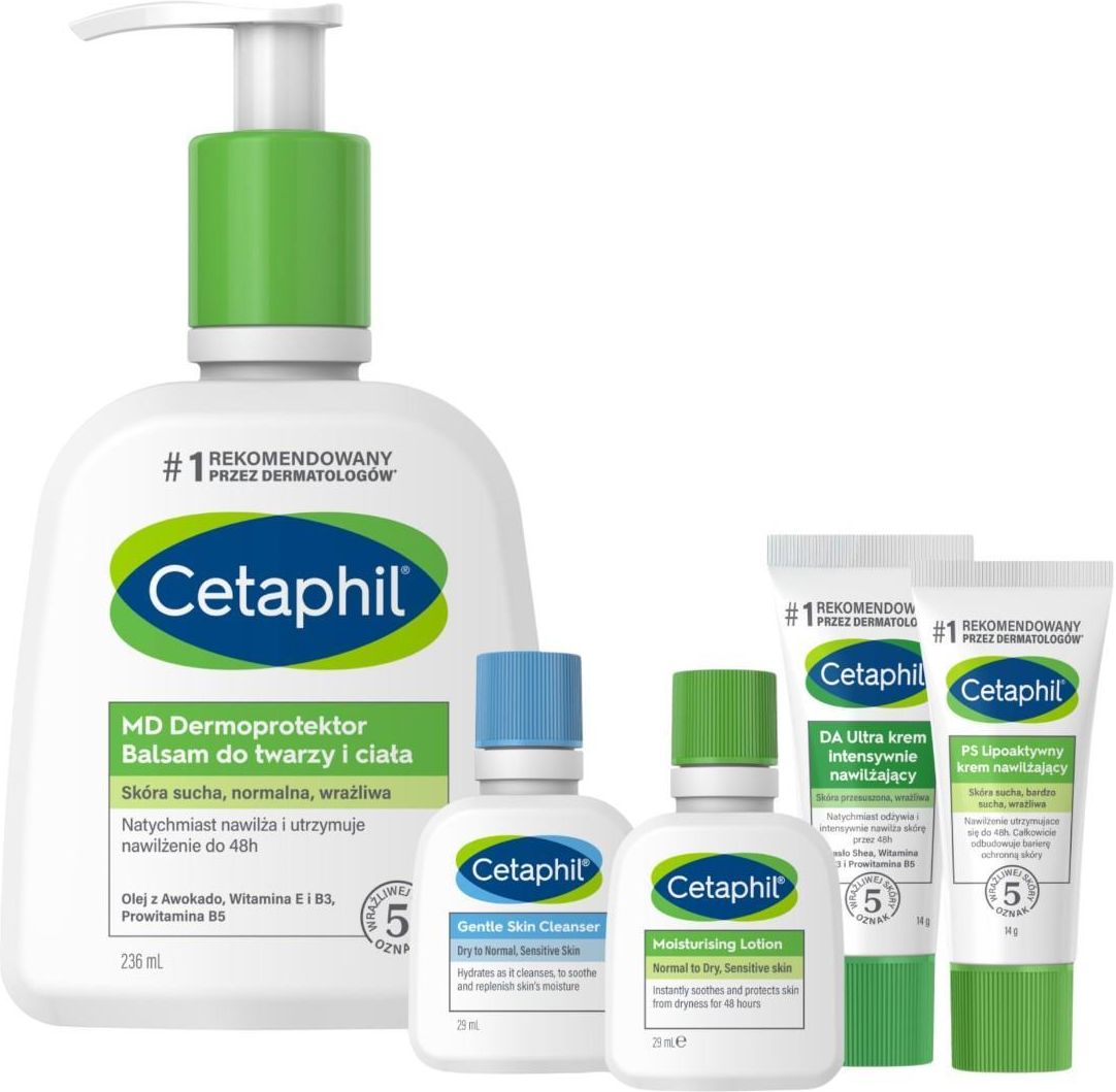 Cetaphil MD Dermoprotektor Poczuj komfort oraz ukojenie skóry każdego dnia z bestsellerowym Cetaphil MD Dermoprotektor Balsamem do twarzy i ciała. To wyjątkowy dermokosmetyk rekomendowany przez dermatologów, stworzony z myślą o codziennej pielęgnacji suchej, wrażliwej, a także normalnej skóry. Formuła z niacynamidem (wit. B3), pantenolem (prowitam. B5) oraz gliceryną intensywnie nawilża, odbudowuje barierę lipidową i przywraca skórze naturalną odporność już od pierwszych dni stosowania. Balsam działa jak inteligentna tarcza – łagodzi, regeneruje, a także chroni skórę przed podrażnieniami nawet przez 48 godzin. Jest bezzapachowy, niekomedogenny i hipoalergiczny, co czyni go odpowiednim także dla osób z problemami dermatologicznymi, takimi jak AZS, łuszczyca czy trądzik różowaty. W zestawie znajduje się również mini produkt Cetaphil – idealny w podróży, do torebki lub do pracy. Dzięki niemu możesz zadbać o skórę wrażliwą zawsze i wszędzie. Mini produkt jest przydzielany losowo na etapie wysyłki. Mogą to być: Cetaphil EM, Emulsja Micelarna do mycia, 29 ml – łagodne oczyszczanie Cetaphil MD Dermoprotektor, Balsam do twarzy i ciała, 29 ml – nawilżenie i ukojenie Cetaphil DA Ultra, Krem intensywnie nawilżający, 14 g – odżywienie i ochrona Cetaphil PS, Lipoaktywny Krem nawilżający, 14 g – intensywna pielęgnacja