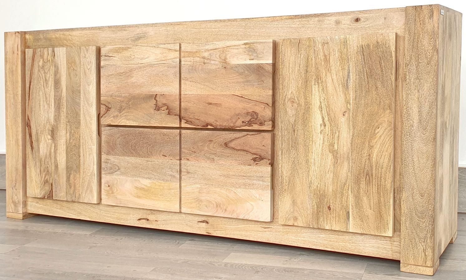 Szerokość: 190cm /Głębokość: 45cm / Wysokość: 85cm / Pojemna komoda z drewna mangoCechy mebla: * 2 szuflady na metalowych prowadnicach * 2 szafki po obu stronach z wewnętrzną półką * wymiary wewnętrzne szuflady: 68,3 x 33,5 x 29 cm * fronty szuflad i bocznych szafek posiadają po bokach wyżłobione …