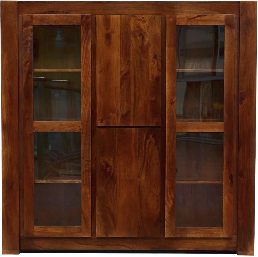 Szerokość 150cm / Głębokość 35cm / Wysokość 150cm / Przeszklona witryna-nadstawka na komodę z drewna mango.Cechy mebla: * witryna przeszklona od frontu * przeszklone boczne drzwiczki z wyżłobionymi uchwytami * drewniane wyjmowane półki * dwie zamykane szafki za drewnianymi frontami * mebel w …