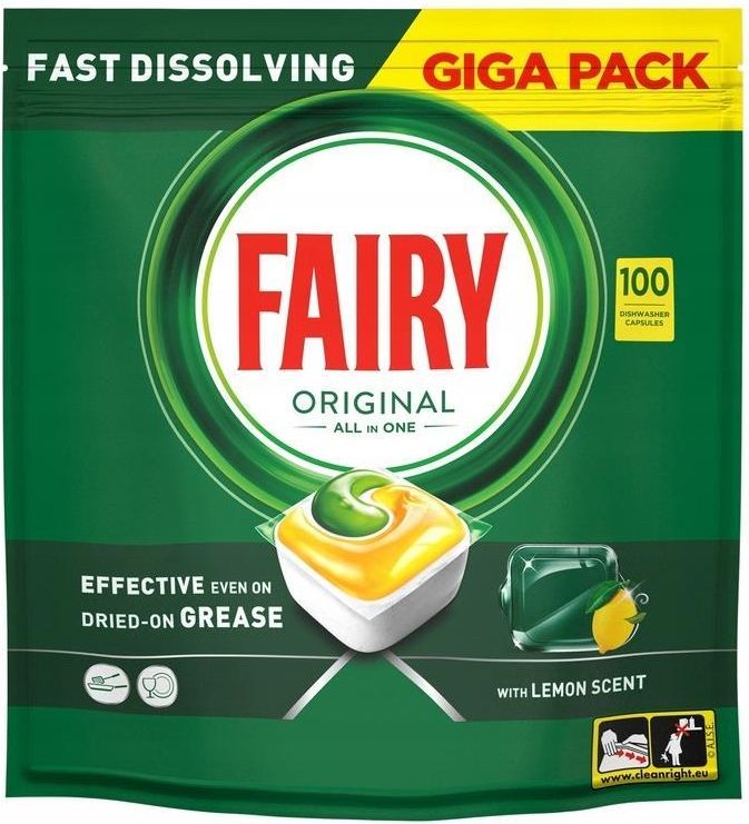 Fairy Kapsułki do zmywarki Orginal All in one Lemon Kapsułki fairy posiadają funkcję soli i funkcję nabłyszczania. Dzięki formule all in one wszystko w jednym nie potrzebujesz już dodatkowych środków do zmywarki. Proste w użyciu – bez konieczności dodatkowego rozpakowywania i brudzenia rąk usuwają nawet najtrudniejsze zabrudzenia już przy pierwszym użyciu Proste w użyciu bez namaczania wstępnego, bez konieczności dodatkowego rozpakowywania i brudzenia rąk zapewniają najwyższą możliwą czystość i blask oraz piękny zapach lemon eliminuje uporczywe plamy tłuszczu, przebarwienia po kawie czy herbacie oraz przypalone resztki jedzenia zapobiegają osiadaniu wapiennego nalotu i kamienia na naczyniach, działają w niskich temperaturach zapewnia połysk i skuteczne czyszczenie Kapsułki o cytrynowym zapachu powodują doskonałe mycie już za pierwszym razem. Są skuteczne nawet w przypadku zaschniętego tłuszczu. Wykonane w technologii zapobiegającej matowieniu. Skutecznie działają w ekocyklach. Bez wstępnego namaczania - oszczędzasz czas i pieniądze Usuwają uporczywe zabrudzenia Oszczędzaj wodę. Nie opłukuj naczyń. eliminuje uporczywe plamy tłuszczu, przebarwienia po kawie czy herbacie oraz przypalone resztki jedzenia zapewniają najwyższą możliwą czystość i blask oraz piękny zapach lemon 48 litrów wody - tyle zaoszczędzisz przez tydzień, jeśli nie będziesz opłukiwać naczyń przed włożeniem ich do zmywarki . Tabletki FAIRY lemon eliminują zabrudzenia już za pierwszym razem, bez potrzeby opłukania naczyń przed włożeniem do zmywarki. Usuwają nawet najtrudniejsze zabrudzenia już przy pierwszym użyciu. Zapewniają połysk i skuteczne czyszczenie. zapobiegają osiadaniu wapiennego nalotu i kamienia na naczyniach, działają w niskich temperaturach Kapsułki do zmywarki w dużym ekonomicznym opakowaniu zawierającym 100 szt. wystarczą na długi czas