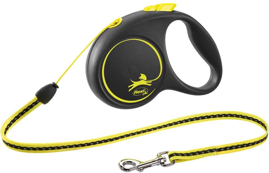 Pięciometrowa smycz flexi w kolorze neonowożółtym z opatentowanym układem hamowania i elementami odblaskowymi oraz mocowaniem do multipojemnika.