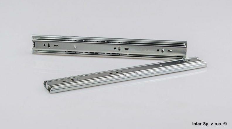 Prowadnica kulkowa H=45 mm, L=450 mm, GX1, GTV WAŻNE!!! Zdjęcia prezentujące oferowany towar mają jedynie charakter poglądowy. Rzeczywisty wygląd w tym w szczególności kolor, usłojenie i struktura materiału mogą odbiegać od prezentowanego na zdjęciach.” Prowadnice kulkowe występują w różnych wariantach: push to open, ze spowalniaczem, miękkim dociągiem, z samodomykiem, w różnych wysokościach i długościach o obciążeniu od 15 do 45 kg. Każdą z tych prowadnic cechuje wysoka jakość i wytrzymałość. Prowadnice kulkowe umożliwiają niemal całkowite wysunięcie szuflady, co jest niezwykle przydatne w przypadku wąskich i płytkich mebli. Mechanizm prowadnicy oparty jest na wytrzymałych stalowych kulkach przemieszczających się w profilach. Szuflada w każdym momencie może być łatwo zdjęta i założona ponownie. Szczegóły produktu Długość [mm]: 450 Wysokość [mm]: 45 Szerokość [mm]: 12.7 Obciążenie [kg]: 30 Sposób montażu: Do boków korpusu Materiał: Stal Pokrycie/Kolor: Ocynk Typ wysuwu: Pełny wysuw Rodzaj mechanizmu ruchu: Kulki Waga [kg]: 1.80