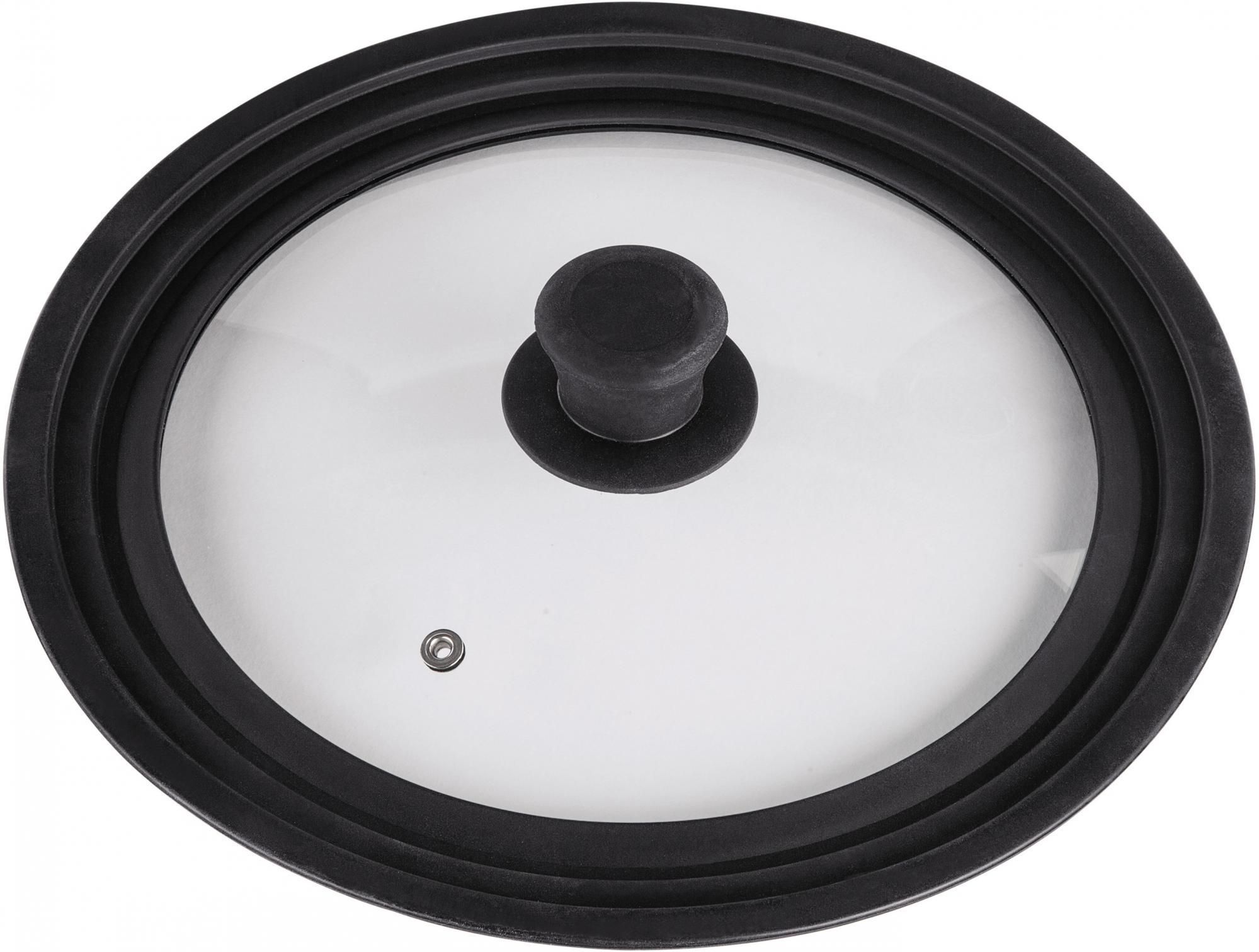 Uniewersalna pokrywka na garnek 24-28 cm duża Szklana pokrywa z otworem na parę i silikonowym pierścieniem do garnków i patelni w rozmiarze od 24 do 28 cmUniwersalny zamiennikW sytuacji kiedy brakuje nam pokrywki kupno uniwersalnej wersji jest bardzo dobrym rozwiązaniem. W tym przypadku mowa o jednym przykryciu nawet na trzy rodzaje garnków i patelni - o średnicy 24, 26 lub 28 cm. Dzięki przeźroczystym wieczku całość będzie pasować do każdego naczynia i pozwoli podejrzeć proces gotowania czy smażenia.WydajnośćZastosowanie giętkiej silikonowej uszczelki pozwala na idealne przyleganie do krawędzi, co na dłużej utrzymuje temperaturę, natomiast odpowietrznik umieszczony w pokrywce daje ujście powstającej parze wodnej i przeciwdziała wrzeniu.PraktycznośćPokrywa może być dogodnie myta pod bieżącą wodą, ale również nadaje się do czyszczenia w zmywarce. Bez problemu można później przechowywać ją w większości szafek, z uwagi na kompaktową budowę.Cechy: Pasuje do: 24, 26, 28 cm Wysokość: 6.5 cm Specjalne funkcje: odpowietrznik przeciw wrzeniu Materiał: Szkło, silikon Typ: Pokrywka płaska szklana Średnica: 28 cm Kolor: Bezbarwny,Czarny Xavax 111545 4047443295644