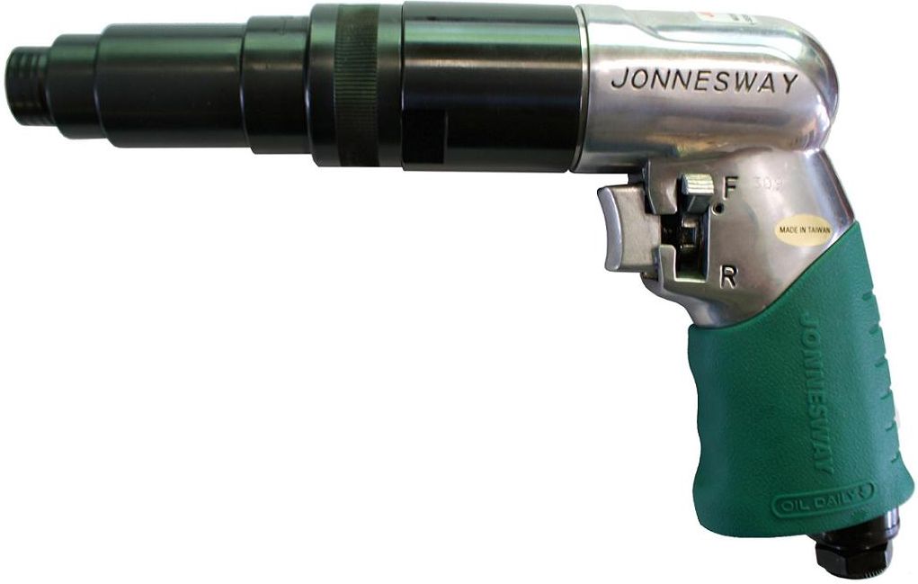 Wkrętarka pneumatyczna JONNESWAY JAB-1018prawo-lewo Dane techniczne: Rozmiar uchwytu mocującego: 1/4"/6,35 mm Prędkość bez obciążenia: 800 obr/min Maksymalny moment obrotowy: 4,5 - 14,5 Nm Sprzęgło wewnętrzne nastawnę Długość całkowita: 226 mm Przyłącze powietrza: 1/4" Wąż zasilający: 8-10 mm Ciśnienie powietrza: 6,2 bar Średnie zużycie powietrza: 113 l/min. Ciężar: 1,3 kg