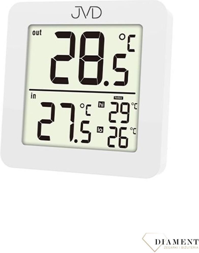 Termometr zewnętrzny wewnętrzny JVD T730 sonda na kablu Termometr firmy JVD, nowy, biały, pomiar temperatury zewnętrznej i wewnętrznej, pamięć pomiarów, zegar, czujnik zewnętrzny na kablu Producent: JVD Model: T730 Termometr JVD z pamięcią temperatur Termometr - pomiar temperatury w pomieszczeniu w zakresie od 0 do +50 stopni C i od -40 do +70 stopni C na zewnątrz. Sonda zewnętrzna na kablu. Długość kabla ok. 2 metry Pamięć pomiarów - wyświetlane są najniższe i najwyższe wartości zarejestrowane w ciągu ostatniej doby Zegar wyświetlanie godziny w formacie 12 lub 24-godzinnym Czytelny wyświetlacz LCD. Wysokość cyfr temperatury w górnej części - 2,5 cm Obudowa biała z tworzywa Termometr można zawiesić na ścianie lub postawić na płaskiej powierzchni Zasilanie. 1 bateria guzikowa CR2032 (w zestawie) Wymiary szerokość 8 cm, wysokość - 8 cm, grubość - 1,2 cm PRODUKT: termometr RODZAJ: stojący, biurkowy, wiszący TARCZA: elektroniczna ROZMIAR: mały KSZTAŁT: kwadratowy KOLOR: biały CYFRY: arabskie MECHANIZM: bezgłośny, elektroniczny MATERIAŁ: tworzywo STYL: nowoczesny POMIESZCZENIE: sypialnia, pokój, mieszkanie, wiatrołap, hol, na zewnątrz ZASILANIE: bateryjne PODŚWIETLENIE: bez podświetlenia FUNKCJE: termometr