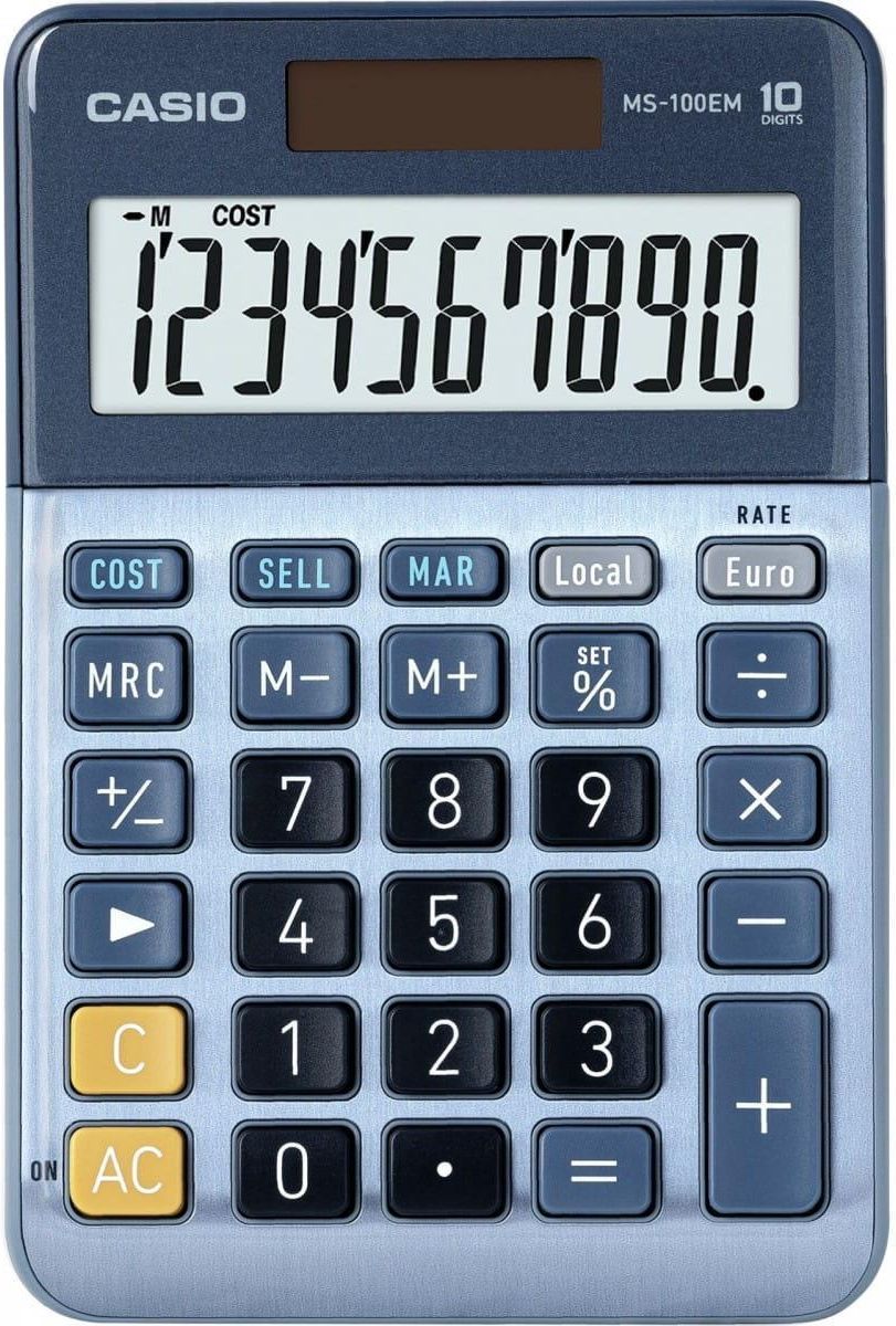 Kalkulator stołowy Casio MS-100EM 10-cyfrowy, niebieski Wyświetlacz: 10 energią słoneczną Przeliczanie walut Ten kompaktowy kalkulator kieszonkowy umożliwia przeliczanie walut, Profi-Procentryczne obliczenie, Cost / Sell / Margin i oferuje takie funkcje, jak Mark Up z przyciskiem procentowym, przycisk szybkiego korekty, zmiana znaku i bufor wprowadzania. Wysokiej jakości wyposażenie: Wytrzymałe klawisze z tworzywa sztucznego i aluminiowy panel przedni zapewniają wysokiej jakości wykończenie. Szczególnie praktyczne są antypoślizgowe nóżki gumowe. Niezależnie od tego, czy w biurze na biurku, podczas kalkulacji handlowych w sklepie lub w domu, w prywatnej księgowości - kalkulator kieszonkowy i biurkowy jest nieodzownym towarzyszem. Uwaga! Opis tego produktu został przetłumaczony automatycznie. Jeśli możemy poprawić go dzięki Tobie, prosimy o kontakt. Wyposażenie: Przeliczanie walut (1 kurs): Po wprowadzeniu i zapisaniu pożądanego kursu walutowego kwoty mogą być łatwo przeliczane na inną walutę Wartość procentowa wyliczonych redukcji wartości · profesjonalna rejestracja procentowa i dyskonto z oddzielnym wskazaniem obliczonej wartości · Mark Up z przyciskiem procentowym: Szybkie określanie marż i podwyżek w handlu · Cost / Sell / Margin: Obliczenie zysku umożliwia ustalenie kosztów, ceny sprzedaży i marży · przycisk szybkiego korekty: Usuwanie aktualnych wpisów do szybkiej korekty bez usuwania całego obliczenia · zmiana znaku +/-: Np. od 100 do -100 lub odwrotnie, za pomocą jednego przycisku · bufor wprowadzania danych: Funkcja zabezpieczania wprowadzonych danych, aby w przypadku szybko następujących po sobie ograniczników nie zostały zablokowane przyciski lub nie zostały wprowadzone żadne dane · pamięć 3 przycisków: Za pomocą przycisków pamięci można zapisać liczby do późniejszego wykorzystania · wskaźnik polecenia zapłaty: Funkcja arytmetyczna, która jest wykonywana, jest pokazywana na wyświetlaczu jako symbol Rozdział tysięcznego: Każda z trzech cyfr stanowi wizualne oznaczenie podziału tysięcznego · zasilanie solarne / akumulatorowe: Urządzenia są zasilane energią słoneczną, a w razie potrzeby zasilane za pomocą baterii · jeśli komputer nie jest używany przez 6 minut, wyłącza się automatycznie. Dzięki temu bateria jest dodatkowo oszczędzana · bateria magazynowa: Zapisane dane, takie jak kursy walutowe lub stawki podatkowe, nie zostaną utracone w przypadku wymiany baterii lub wyłączenia zasilania elektrycznego · aluminiowy panel przedni: Powierzchnia o bardzo wytrzymałych właściwościach · gumowe nóżki: Z tyłu urządzenia · wymiary: 28 x 101 x 149 mm, waga: 120 g. Dane techniczne: Długość produktu: 101 mm · Głębokość produktu: 28 mm · Kolor producenta: niebieski · Maksymalne wskazanie (rodzaj, wielkośc, liczby/pozycje/rozdzielczość): 1-rzędowy · Rodzaj wyświetlacza: TFT/LCD, kolorowy · Specyfikacja kalkulatora: Przeliczanie walut · Szerokość produktu: 149 mm · Waga: 120 g · Wyświetlacz: 10 · Zasilanie: energią słoneczną · Źródło zasilania: Ogniwa solarne