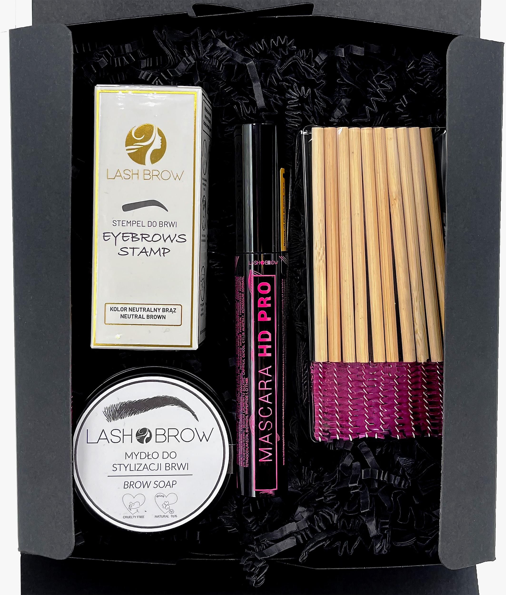 Lash Brow Zestaw Kosmetyków do Makijażu nr.2 Lash Brow Zestaw Kosmetyków do Makijażu nr.2 to kompletny zestaw do stylizacji brwi i rzęs, idealny dla osób, które cenią naturalny efekt, trwałość i komfort aplikacji. To świetny pomysł na prezent dla miłośniczek perfekcyjnie podkreślonych brwi. W skład zestawu wchodzi stempel w odcieniu neutral brown, który pozwala szybko i precyzyjnie uzyskać naturalny kształt brwi. Mydło do stylizacji nadaje włoskom pełny, uporządkowany wygląd, a mascara HD PRO z silikonową szczoteczką zapewnia dokładne podkreślenie rzęs oraz trwały efekt. Zestaw uzupełniają spiralki (10 sztuk), które pomagają w równomiernym rozczesaniu i ułożeniu brwi. Dzięki Lash Brow Zestawowi Kosmetyków do Makijażu nr.2 codzienna stylizacja staje się szybka, wygodna i pozwala uzyskać efekt pełnych, naturalnie zaznaczonych brwi. Korzyści ze stosowania - Kompletny zestaw do stylizacji brwi i rzęs - Naturalny, podkreślony kształt brwi dzięki stemplowi - Trwały, uporządkowany efekt po użyciu mydła i mascar - Łatwe rozczesanie i ułożenie brwi dzięki spiralnym szczoteczkom Sposób użycia Użyj stempla, aby zaznaczyć kształt brwi, następnie utrwal włoski mydłem. Wytuszuj rzęsy mascarą HD PRO, a spiralek używaj do codziennego rozczesywania i stylizacji brwi.