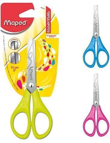 Nożyce szkolne Essentials 13cm od Maped Nożyce szkolne Essentials to wysokiej jakości narzędzie do codziennego użytku dla dzieci. Wykonane są ze stali nierdzewnej, co zapewnia ich trwałość i odporność na korozję. Ostrza mają długość 10 mm, są grawerowane i wyposażone w zaokrąglone końcówki, co zwiększa bezpieczeństwo podczas pracy. Plastikowe uchwyty nożyczek zostały specjalnie opracowane, aby idealnie pasować do małych dłoni dziecka. Dostosowany profil uchwytów sprawia, że nożyce są wygodne w użytkowaniu i bezproblemowe w trzymaniu nawet podczas długo trwającej pracy. Nożyce Maped Essentials mają długość 13 cm. Produkt oferowany jest w miksie 3 kolorów: niebieskim, zielonym i różowym. Kolor wysyłany jest losowo, dzięki czemu każde dziecko otrzyma własne, unikatowe nożyce do szkolnych zmagań. Niezależnie od koloru, nożyce te są niezwykle praktyczne i funkcjonalne. EAN: 3154144642101