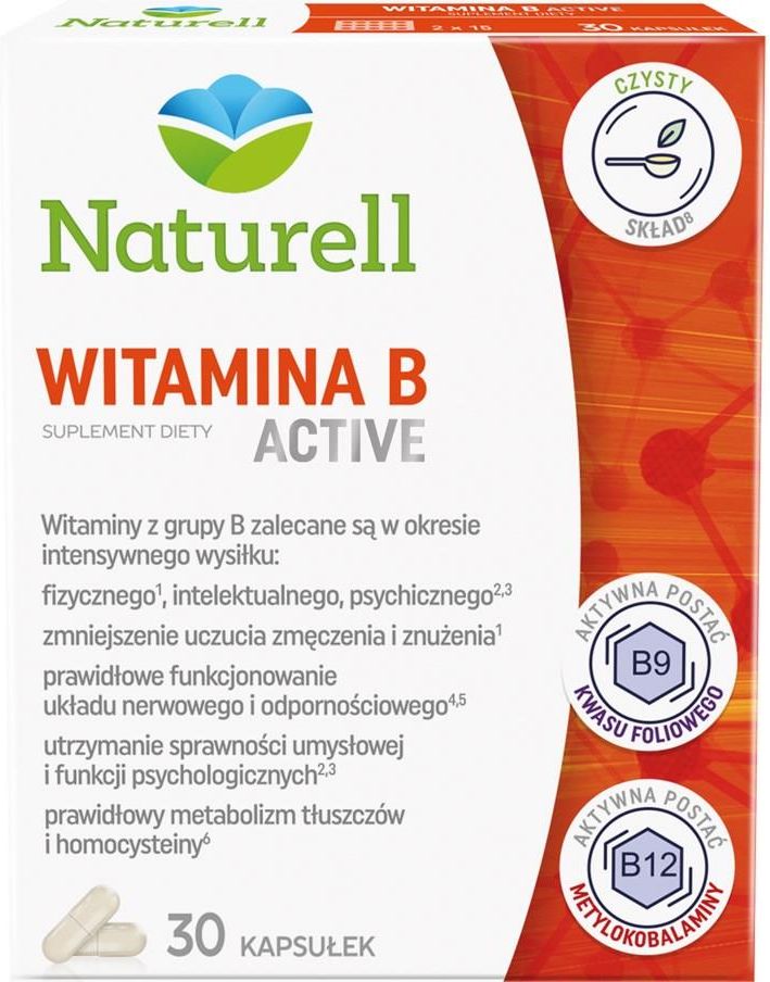 Opis: Naturell Witamina B Active suplement diety uzupełnia codzienną dietę w witaminy z grupy B - zmniejsza uczucie zmęczenia i znużenia, wspiera prawidłowe funkcjonowanie układu nerwowego i odpornościowego. Działanie i zastosowanie: Właściwości witamin z grupy B: Witaminy z grupy B to substancje rozpuszczalne w wodzie, które z wyjątkiem witaminy B12 nie są magazynowane w organizmie i musza być dostarczane z pożywieniem każdego dnia. Witaminy te możemy znaleźć w produktach zbożowych, mięsie, jajach, rybach, mleku, roślinach strączkowych oraz w świeżych warzywach. Witaminy z grupy B jednak łatwo ulegają zniszczeniu bądź wypłukaniu podczas przechowywania oraz procesów obróbki żywności, dlatego powinniśmy zwrócić szczególną uwagę na to, czy nasza dieta zawiera je w wystarczającej ilości. Witaminy z grupy B wykazują duży wpływ na prawidłowy przebieg wielu procesów w naszym organizmie. Naturell Witamina B Active: zawiera witaminę B12 w formie metylokobalaminy. Metylokobalamina jest to aktywna forma witaminy B12, dlatego nie wymaga udziału wszystkich enzymów potrzebnych do przekształcenia formy nieaktywnej biologicznie w aktywna. Dzięki temu cechuje ją wysoka biodostępność i tolerancja, zawiera aktywną formę kwasu foliowego (L-metylofolian wapnia), która nie musi ulegać tak wieloetapowej przemianie w organizmie do formy aktywnej, jak nieaktywny kwas foliowy. O prawidłowym metabolizmie kwasu foliowego decyduje gen MTHFR, którego mutacja występuje nawet u 30-50% populacji. U osób tych skuteczność przekształcania kwasu foliowego do aktywnej postaci może zmniejszyć się aż o 70%. Badania naukowe potwierdzają, że wiele osób nie w pełni metabolizuje kwas foliowy. Naturell Witamina B Active zawiera czysty skład - bez substancji wypełniających, barwników, konserwantów syntetycznego pochodzenia. Naturell Witamina B Active nie zawiera glutenu, cukru ani laktozy. Kiedy warto stosować suplement diety Naturell Witamina B Active: wspomaganie organizmu w okresach intensywnego wysiłku intelektualnego, psychicznego (witaminy: B1, B6, B12, B9, niacyna i biotyna) oraz fizycznego (witaminy: B2, B6, B12, B9, kwas pantotenowy, niacyna), uzupełnianie ilości witamin z grupy B w niezbilansowanej diecie, uzupełnianie ilości choliny w niezbilansowanej diecie: zapotrzebowanie na cholinę zmienia się w zależności od wieku, płci oraz poziomu aktywności fizycznej; wzrasta w przypadkach częstego rozdrażnienia i wzmożonego napięcia nerwowego oraz w przypadku spożywania dużej ilości alkoholu. Działanie witamin z grupy B: Zmniejszenie uczucia zmęczenia, wsparcie funkcji psychologicznych witaminy B6, B12, biotyna, kwas foliowy, niacyna, tiamina (witamina B1) - wspomagają utrzymanie prawidłowych funkcji psychologicznych, witaminy B6, B12, kwas foliowy, kwas pantotenowy, niacyna, ryboflawina (witamina B2) przyczyniają się do zmniejszenia uczucia zmęczenia i znużenia. Sprawność umysłowa kwas pantotenowy - wspomaga utrzymanie sprawności umysłowej na prawidłowym poziomie, witaminy B6, B12, biotyna, niacyna, ryboflawina (witamina B2), tiamina (witamina B1) - wspomagają prawidłowe funkcjonowanie układu nerwowego. Odporność witaminy B6, B12, kwas foliowy - wspomagają prawidłowe funkcjonowanie układu odpornościowego. Metabolizm homocysteiny witaminy B6, B12, kwas foliowy oraz cholina – pomagają w utrzymaniu prawidłowego metabolizmu homocysteiny. Metabolizm witaminy B6, B12, biotyna, kwas pantotenowy, niacyna, ryboflawina (witamina B2), tiamina (witamina B1) – przyczyniają się do utrzymania prawidłowego metabolizmu energetycznego, witamina B6 - przyczynia się do utrzymania prawidłowego metabolizmu białka i glikogenu, cholina - przyczynia się do utrzymania prawidłowego metabolizmu tłuszczów. Produkcja krwi witaminy B6, B12 - wspomagają prawidłowa produkcje czerwonych krwinek, kwas foliowy - wspomaga prawidłowa produkcje krwi. Równowaga hormonalna kwas pantotenowy - przyczynia się do prawidłowej syntezy i metabolizmu hormonów steroidowych, witaminy D i niektórych neuroprzekazników, witamina B6 - przyczynia się do regulacji aktywności hormonalnej. Zdrowa skóra i włosy biotyna, niacyna, ryboflawina (witamina B2) - wspomagają utrzymanie zdrowej skóry, biotyna - wspomaga utrzymanie zdrowych włosów. Wsparcie wątroby cholina pomaga w prawidłowym funkcjonowaniu wątroby Skład: Składniki: dwuwinian choliny; niacyna (amid kwasu nikotynowego); hydroksypropylometyloceluloza (kapsułka); kwas pantotenowy (D-pantotenian wapnia), witamina B6 (chlorowodorek pirydoksyny); ryboflawina; tiamina (monoazotan tiaminy); kwas foliowy (L-metylofolian wapnia); biotyna (D-biotyna); witamina B12 (metylokobalamina). Składnik - 1 kapsułka zawiera: dwuwinian choliny - 205 mg, w tym: cholina - 82,5 mg niacyna - 100 mg (625% RWS) kwas pantotenowy - 12 mg (200% RWS) witamina B6 - 10 mg (714% RWS) ryboflawina - 10 mg (714% RWS) tiamina - 8 mg (727% RWS) kwas foliowy - 200 µg (100% RWS) biotyna - 150 µg (300% RWS) witamina B12 - 100 µg (4000% RWS) * RSW - procent realizacji Referencyjnych Wartości Spożycia Sposób użycia i dawkowanie: Sposób użycia: Kapsułkę można połykać w całości lub otworzyć i jej zawartość rozpuścić w letnim płynie (spożyć bezpośrednio po przygotowaniu). Zalecana porcja do spożycia w ciągu dnia: Dorośli – 1 kapsułka dziennie Przeciwwskazania: Nadwrażliwość na którykolwiek składnik preparatu. Kobiety w ciąży i matki karmiące stosowanie preparatu powinny skonsultować z lekarzem. Nie stosować łącznie z innymi preparatami zawierającymi witaminy z grupy B. Ostrzeżenia: Nie przekraczać zalecanej porcji do spożycia w ciągu dnia. Suplement diety nie może być stosowany jako substytut (zamiennik) zróżnicowanej diety. Zrównoważony sposób odżywiania i zdrowy tryb życia są podstawa prawidłowego funkcjonowania organizmu. Zbrylanie wsadu kapsułki jest p