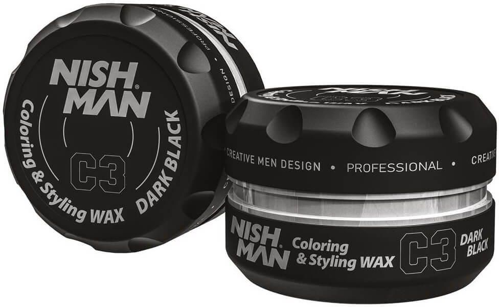 Nishman Pomada do włosów Coloring Styling Wax C3 Dark Black 100 ml Turecka pomada do włosów o efekcie koloryzującym na czarny kolor ma łagodną konsystencję i bardzo wygodnie nakłada się na włosy. Pomada o numerze C3 to wodno woskowa formuła o średnim chwycie, a także matowym wykończeniu o efekcie czarnych włosów. Czarny kolor na włosach utrzymuje się do momentu pierwszego mycia. Dodatkowo pomada nie skleja włosów, łatwo się zmywa i ma piękny męski świeży zapach utrzymujący się przez wiele godzin. Najważniejsze informacje: pomada o właściwościach koloryzujących wodno woskowa baza delikatna konsystencja średni poziom utrwalenia matowe zakończenie czarny efekt włosów Dark Black męski świeży aromat pojemność 100 ml producent: Nishman Zastosowanie: Niewielką ilość pomady rozetrzyj na dłoniach i nałóż we włosy, stylizuj za pomocą dłoni lub grzebienia, po nałożeniu odczekaj 5-7 minut by włosy nabrały pożądanego koloru oraz utrwalenia. Składniki / Ingredients: Aqua, Petrolatum, Cetyl Alcohol, Stearyl Alcohol, Ceteareth-25, Beeswax, Dimethicone, Sorbitol, Isopropyl Myristate, PVP, Parfum, Phenoxyethanol, Cetrimonium Chloride, Myristyl Alcohol, Arachidyl Alcohol, Triethanolamine, Lauryl Alcohol, Iodopropynyl Butylcarbamate, Benzyl Salicylate, D-Limonene, Linalool, Coumarin.[+/-: Mica, CI 77891, CI 77492, CI 77499, CI 15985, CI 19140, CI 77510, CI 77742, CI 15850]