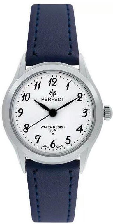 Damski klasyczny okrągły czytelny zegarek Perfect LXC009S-05 - metalowa koperta w kolorze srebrnym, granatowy skórzany przeszywany pasek, biała tarcza czasomierza, kontrastowe cyfry i wskazówki, klasa szczelności 30M. Japoński mechanizm kwarcowy