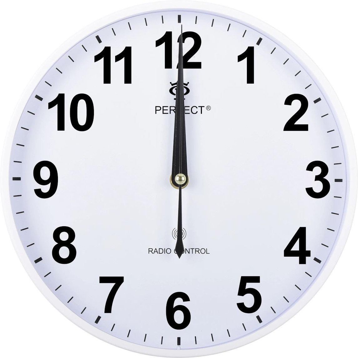 Biały czytelny okrągły klasyczny zegar ścienny Perfect PW347-2100-1. Mechanizm kwarcowy sterowany radiowo, wersja europejska DCF77. Obudowa z tworzywa. Płaska szklana szybka. Średnica 25,5 cm. Zegar do pokoju, salonu, kuchni