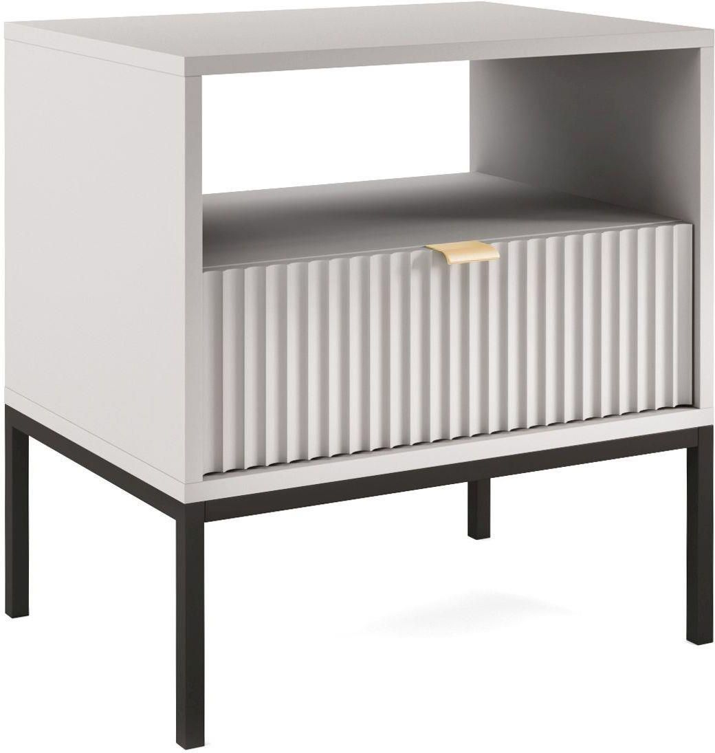 STOLIK NOCNY NOVA S54 SZARY jest nowoczesnym meblem przeznaczonym do sypialni, gdzie umieszczony obok łóżka podwyższy komfort wypoczynku. Ma prostokątny blat i został wyposażony w szufladę z metalowym uchwytem oraz otwartą półkę, które zapewnią wygodne i praktyczne przechowywanie. Jego szary front jest wykonany z trwałej płyty MDF oklejonej jednostronnie folią. Korpus STOLIKA NOCNEGO NOVA S54 SZARY został zrobiony z wytrzymałej płyty laminowanej, która charakteryzuje się zwiększoną odpornością na wilgoć, temperaturę oraz uszkodzenia mechaniczne. Jej powierzchnia nie przyciąga kurzu i nie zmienia koloru pod wpływem działania promieni słonecznych. Stelaż stolika stanowi rama z czterema prostymi nóżkami wykończona w czarnym kolorze.