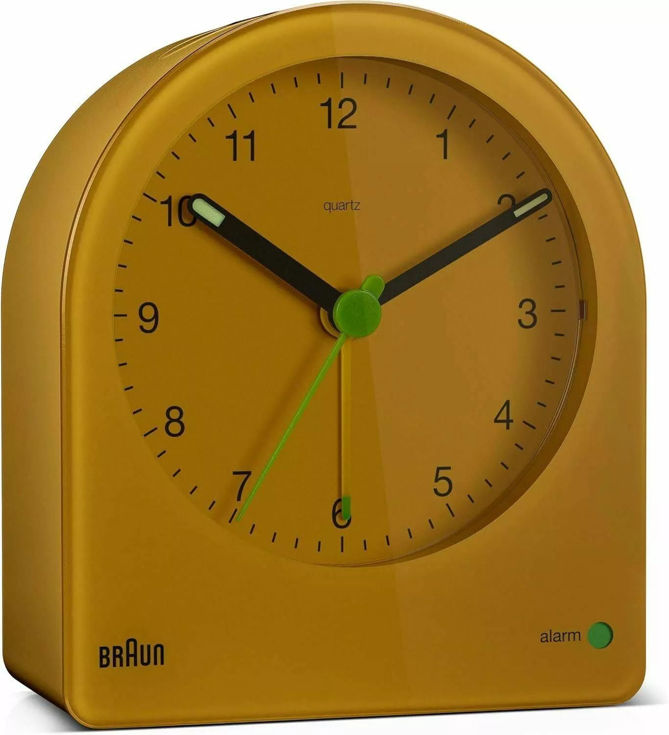 Klasyczny żółty półokrągły budzik BRAUN BC22Y - cichy mechanizm, automatyczne podświetlenie, drzemka, neobrite, budzenie narastającym dźwiękiem elektronicznym, żółta matowa obudowa, żółta tarcza