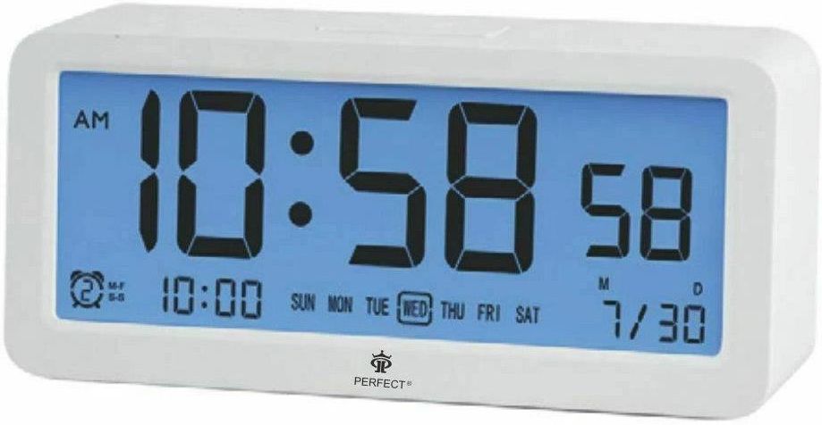 Biały nieduży zegar biurkowy / budzik do sypialni Perfect z podświetlanym wyświetlaczem i kalendarzem. Trzy alarmy z funkcją drzemki. Czytelny podświetlany budzik