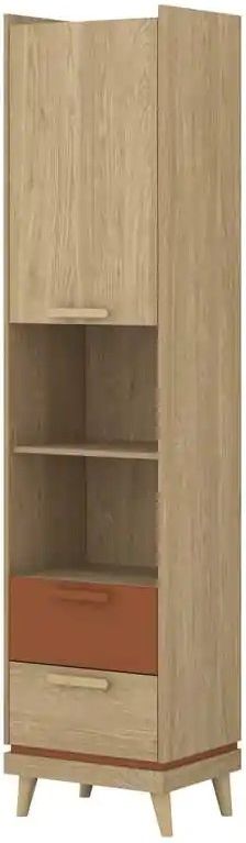 Wysoka witryna SCANDI w kolorze dąb olejowany + ceglany to połączenie naturalnej estetyki z nowoczesną funkcjonalnością, charakterystyczną dla stylu skandynawskiego. Jasny dekor dębu olejowanego z widocznym usłojeniem wprowadza do wnętrza ciepło i lekkość, a ceglana szuflada stanowi wyrazisty, ale harmonijny akcent kolorystyczny. Smukła forma mebla sprawia, że witryna świetnie sprawdzi się zarówno w salonie, jak i w jadalni, sypialni czy pokoju młodzieżowym, nie przytłaczając przestrzeni. Funkcjonalny układ – półki, szuflada i zamykana strefa Witryna SCANDI została zaprojektowana z myślą o wygodnym przechowywaniu i estetycznej organizacji. Otwarta część z półkami doskonale nadaje się do ekspozycji książek, dekoracji lub naczyń, natomiast zamykana górna strefa pozwala zachować porządek i ukryć przedmioty codziennego użytku. Praktyczna szuflada w kolorze ceglastym zapewnia dodatkowe miejsce na drobne akcesoria, dokumenty lub tekstylia. Całość uzupełniają subtelne uchwyty oraz stabilne, drewniane nóżki, które nadają meblowi lekkości i podkreślają jego skandynawski charakter. To funkcjonalna witryna do salonu, zaprojektowana z myślą o codziennym komforcie użytkowania. Uniwersalny mebel do nowoczesnych i skandynawskich aranżacji Dzięki stonowanej kolorystyce i ponadczasowej formie, witryna SCANDI dąb olejowany + ceglany doskonale wpisuje się w różne aranżacje wnętrz – od nowoczesnych, przez skandynawskie, aż po bardziej przytulne, naturalne przestrzenie. Mebel można zestawić z innymi elementami kolekcji SCANDI, tworząc spójną i harmonijną zabudowę, lub wykorzystać jako samodzielny akcent w pomieszczeniu. To idealny wybór dla osób, które szukają wysokiej witryny z półkami i szufladą, łączącej estetykę, funkcjonalność i wyrazisty detal kolorystyczny. Wymiary Szerokość: 50 cm Głębokość: 40 cm Wysokość: 215 cm