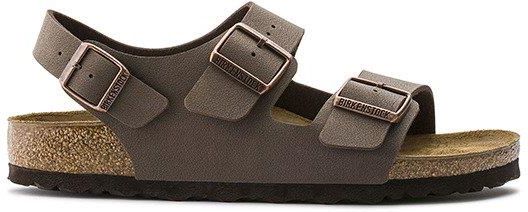 Birkenstock Milano BS 0634501 Mocca Birkenstock Milano BS 0634501 w kolorze Mocca to klasyczne sandały stworzone z myślą o maksymalnym komforcie i stabilności. Model Milano jest rozwinięciem kultowego modelu Arizona – został wyposażony w dodatkowy pasek na pięcie, który zapewnia lepsze trzymanie stopy podczas chodzenia. Cholewka wykonana jest z materiału Birko-Flor® Nubuck, który imituje naturalną skórę nubukową, a jednocześnie jest trwały, łatwy w pielęgnacji i przyjemny w dotyku. Wewnętrzna część posiada miękką wyściółkę, która zwiększa komfort noszenia nawet podczas długiego użytkowania. Najważniejszym elementem konstrukcji jest oryginalna wkładka Birkenstock wykonana z korka i lateksu, która dopasowuje się do kształtu stopy. Profilowana konstrukcja wspiera naturalne ułożenie stopy, posiada głęboką miseczkę pięty, podparcie łuku stopy oraz przestrzeń dla palców. Całość uzupełnia lekka podeszwa z materiału EVA zapewniająca amortyzację i elastyczność podczas chodzenia. Sandały posiadają trzy regulowane paski z metalowymi klamrami, dzięki którym można idealnie dopasować obuwie do stopy. Model jest przeznaczony do codziennego użytkowania i sprawdzi się zarówno w mieście, jak i podczas letnich podróży.