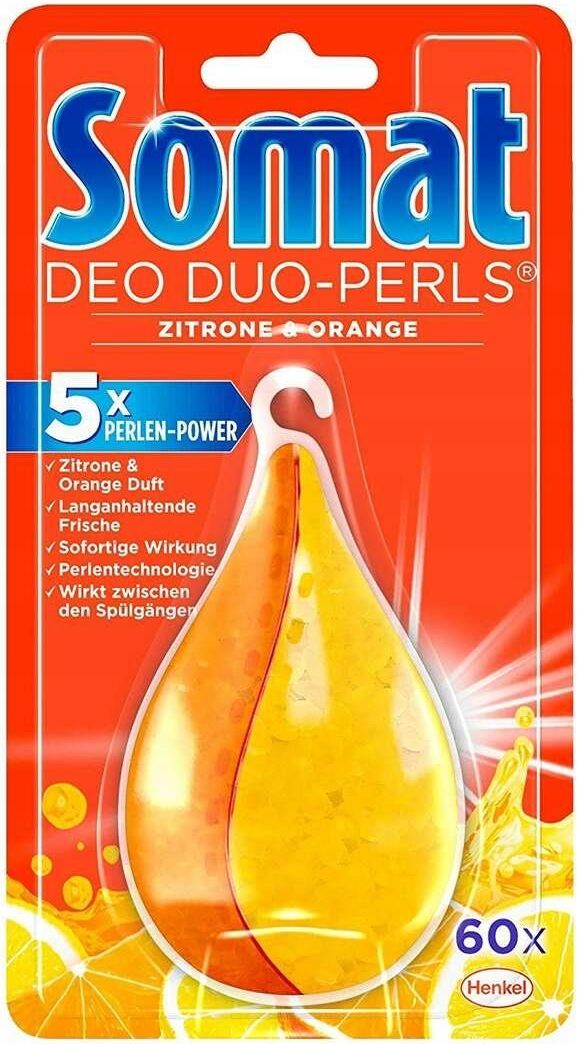 Zapach do Zmywarki Somat Duo Cytryna i Pomarańcza 17g Zawieszka Niemiecka Somat deo perls zapach do zmywarki cytrusowy 17g Dzięki dwukomorowemu systemowi Somat Deo Duo-Perls zapewniają stałe uwalnianie dwóch świeżych zapachów, cytryny i pomarańczy, od pierwszego do ostatniego płukania Unikalna technologia Duo-Perls promieniuje długotrwałą świeżością i neutralizuje nieprzyjemne zapachy w zmywarce Moc 5 x perłowy zapewnia, że ​​wnętrze zmywarki zawsze pachnie przyjemnie świeżo i czysto Unikaj kontaktu z elementami grzewczymi Na 60 cykli płukania! Nie połykać. Przechowywać poza zasięgiem dzieci. Unikać kontaktu z oczami. W razie kontaktu dokładnie przemyć oczy wodą. Sposób użycia Wyjmij produkt z opakowania a następnie zawieś Somat Deo Duo-Perls na górnej półce zmywarki. Upewnij się, że dysze mogą się swobodnie obracać. Ciesz się świeżością. O marce Somat Od 1962 roku Somat, marka firmy Henkel, jest ekspertem w dziedzinie automatycznego zmywania naczyń, zapewniającego doskonałe rezultaty bez konieczności wstępnego i późniejszego mycia. Dzięki ponad 50-letniemu doświadczeniu i niemieckiej technologii, Somat koncentruje się na potrzebach konsumentów i innowacyjności. W trosce o ochronę środowiska w kwietniu 2016 r. Somat wprowadził nowe standardy jakości swoich produktów, które nie zawierają fosforanów. Somat oferuje szeroką gamę środków czyszczących i dodatków do zmywarek, w tym innowacyjne produkty, takie jak tabletki Somat Gold z 12 funkcjami umożliwiające skuteczne usuwanie przypaleń.
