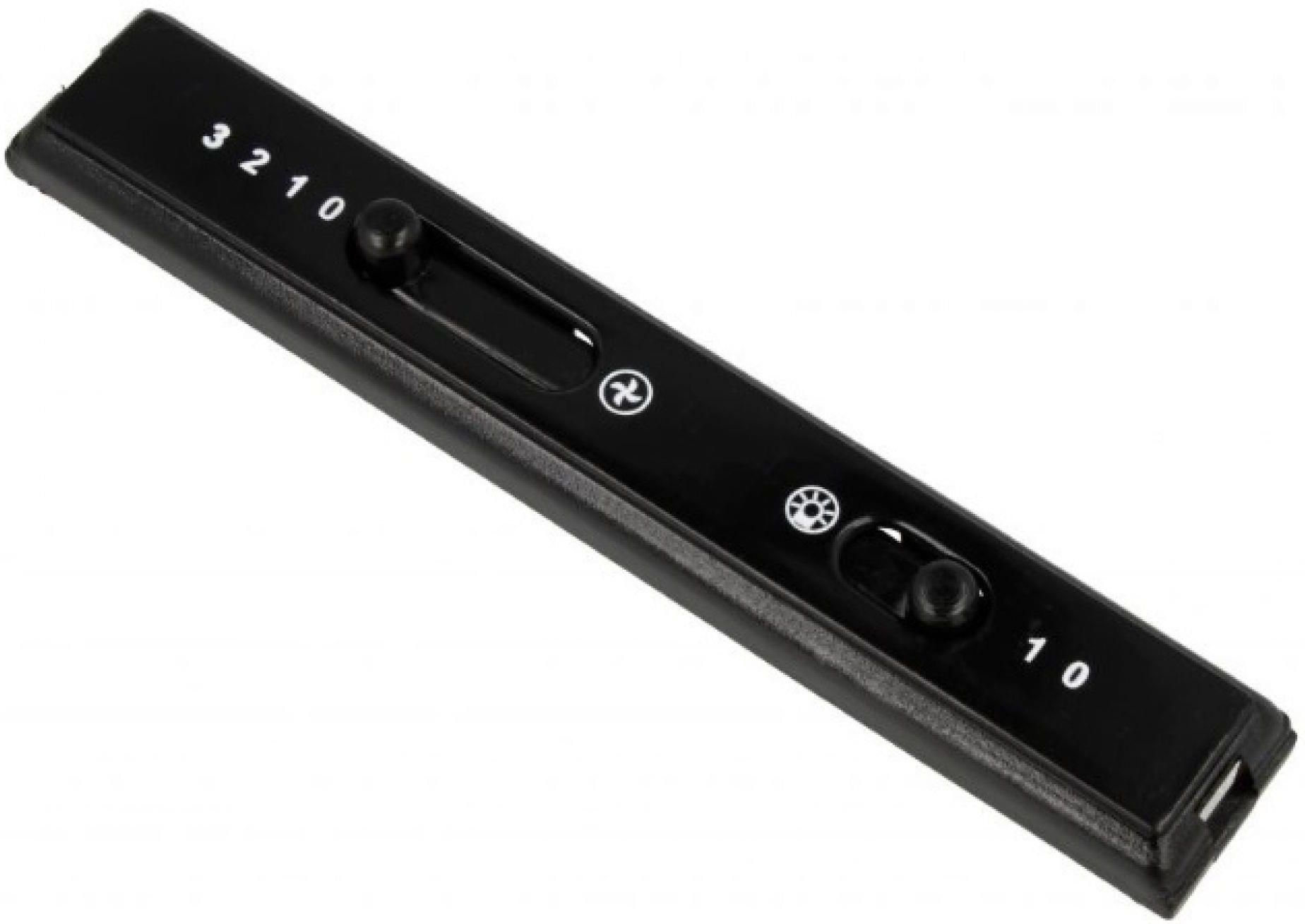 Suwak, panel sterowania okapów Neto, Kernau Część zamienna do okapów kuchennych marek Neto i Kernau. Panel z mechanicznymi suwakami odpowiadającymi za sterowanie oświetleniem i pracą silnika. Przeznaczony do modeli wyposażonych w manualne sterowanie przesuwne. Idealny do naprawy lub wymiany zużytego elementu. Wymiary: długość 145 mm szerokość 21 mm