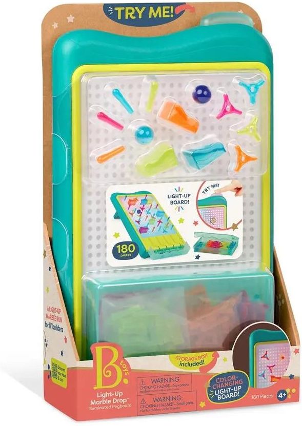Light-Up Marble Drop podświetlany tor kulkowy i świetlna tablica 2w1 B.Toys 4+ Light-Up Marble Drop to innowacyjny zestaw 2w1, który łączy podświetlany tor kulkowy (do zbudowania) ze świetlną tablicą artystyczną. Dzięki temu dzieci mogą tworzyć dynamiczne tory dla kulek, a także projektować i eksponować swoje wizualne dzieła na podświetlonym panelu. To zabawka, która łączy elementy konstrukcyjne, logiczne, artystyczne i światło-efektowe. Dziecko wpina elementy kulodromu (rampy, spirale, kołeczki dekoracyjne) do perforowanego panelu z otworkami. samodzielnie projektując trasy toru. Podczas zabawy dziecko może eksperymentować z długością trasy, prędkością kulki i poziomem skompikowania trasy. Gdy kulka przebiegnie całą trasę wpada do kieszonki z punktacją na dole tablicy. Drugą funkcją zabawki jest możliwość układania obrazków i wzorów poprzez wpinanie kolorowych kołeczków w tablicę. Zabawka konstrukcyjnaLight-Up Marble Drop świetnie wspiera ćwiczenie myślenia logicznego i przestrzennego, rozwój kreatywności oraz rozwija motorykę i zręczność. Tablica ze światełkiem LED niezwykle podnosi atrakcyjność zabawki - można podświetlić ułożony tor, lub ułożony wzór - efekt staje się wyraźny w ciemności. Panel wyposażony jest w przycisk do zmiany kolorów, a także funkcję automatycznego wyłączania, co pozwala oszczędzać baterie. Zestaw zawiera 1 perforowany panel LED (pegboard) Rampy – lewa i prawa (po 5 sztuk), 16 elementów obrotowych / wirujących, 8 kul z imitacją szkła, 140 kolorowych kołeczków 4 szablony artystyczne, pudełko do przechowywania (doczepiane do panelu), instrukcje montażu i ilustracje Zalety zabawki Zabawa pobudza dzieci do samodzielnego projektowania i eksperymentowania Świetny pomysł na prezent kreatywny / edukacyjny na urodziny, święta czy okazje szkolne Idealna zabawka logiczna do przedszkoli, świetlic lub placówek edukacyjnych Wspiera rozwój dziecka w niezwykle atrakcyjny sposób Świetny pomysł na prezent edukacyjny dla dzieci 4+ SPECYFIKACJA Light-Up Marble Drop – podświetlany tor kulkowy + świetlna tablica artystyczna 2w1 (180 elementów) Zabawka wolna od ftalanów i BPA (Bisfenolu A). Wymiary opakowania: ok. 35 × 21 × 9 cm Wiek: 4+ Zasilanie: 4 × baterie AA (w zestawie) Ostrzeżenia: nieodpowiednie dla dzieci poniżej 3 lat (małe elementy i kulki); panel świetlny może wywołać atak epilepsji u podatnych osób