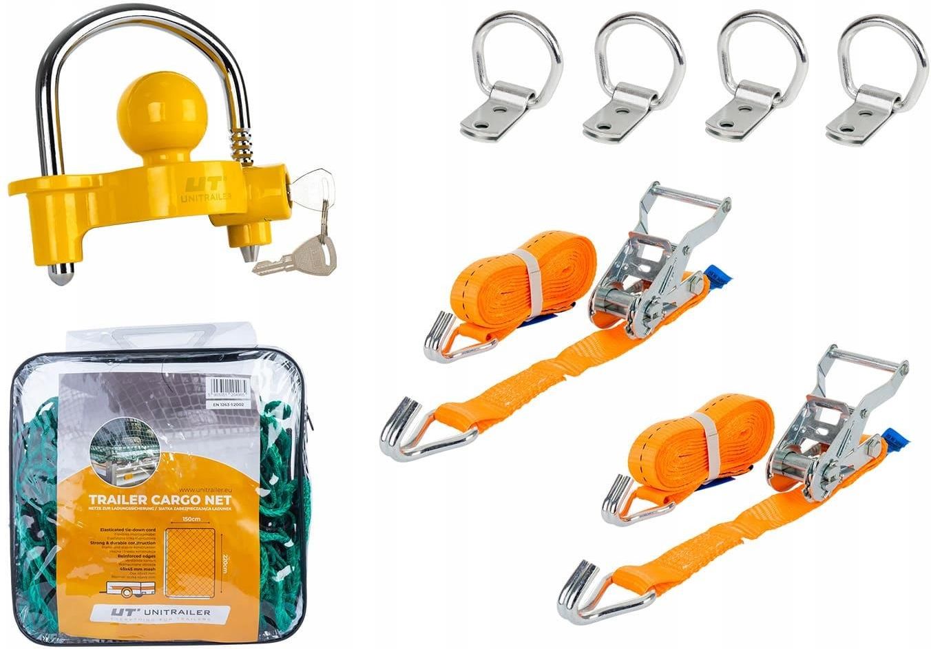 Zestaw akcesoriów do przyczep Premium plus Oryginalny produkt marki: UNITRAILER Zestaw zabezpieczeń i wyposażenia przyczepy samochodowej. Zawiera elementy, które mają zapewnić bezpieczeństwo i stabilność ładunku podczas transportu oraz zabezpieczyć przyczepkę przed kradzieżą. Zestaw startowy do przyczep samochodowych Cały zestaw zapewnia kompleksowe zabezpieczenie ładunku na przyczepie podczas transportu. Dzięki zastosowaniu tych elementów można mieć pewność, że przewożony ładunek będzie stabilny i bezpieczny podczas podróży. Dodatkowo umieszczone w zestawie zabezpieczenie zaczepu kulowego zapewni bezpieczeństwo Twojej przyczepy podczas odpięcia jej od haka samochodu. Zestaw zabezpieczeń do przyczepy zawiera Zabezpieczenie zaczepu kulowego przyczepy UNITRAILER - wysokiej jakości uniwersalne zabezpieczenie zaczepu przyczepy, które skutecznie zabezpiecza zaparkowaną przyczepę przed kradzieżą. 4 x Uchwyt podłogowy WINTERHOFF do mocowania pasów- uchwyty przeznaczone do montażu na podłodze przyczepy służące do bezpiecznego mocowania pasów. Siatka transportowa na przyczepę UNITRAILER - element służący do zabezpieczania ładunku na przyczepie. Zapobiega wypadnięciu lub przemieszczaniu się ładunku podczas transportu. 2 x Pas transportowy mocujący z napinaczem UNITRAILER 4M/25mm/1T - niezbędny element do mocowania ładunku na przyczepie. Posiada napinacz, który umożliwia precyzyjne dopasowanie długości pasa do ładunku.