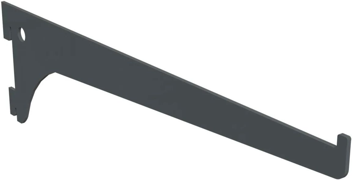 Wspornik pojedynczy antracyt 200 mm Jest to wykonany z wysokiej jakości stali wspornik jednootworowy o maksymalnym udźwigu 60 kg. Wspornik pasuje do wszystkich systemów regałów ściennych o rozstawie otworów 50 mm. Posiada dwa haczyki ułatwiające zawieszenie. Idealny do podparcia zarówno półek stalowych, jak i drewnianych.