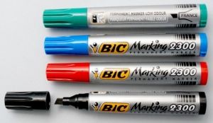 Marker permanentny BiC Marking 2300, CZERWONY Parametry produktu: Kod producenta: 3086129999750 Kolor: czerwony Liczba sztuk w opakowaniu: 1 szt. Marka: BIC Rodzaj: permanentny Stan: Nowy * markery z tuszem na bazie alkoholu, bezzapachowe * polipropylenowa obudowa o średnicy 20 mm i długości 13,8 cm zawiera 5,4 g atramentu * bez skuwki nie wysychają przez 3 tygodnie * zablokowana końcówka nie ugina się i nie cofa pod naciskiem, skuwka i zakończenie w kolorze tuszu * długość linii pisania dla końcówki okrągłej: 1400 m, ściętej: 1100 m * marker BIC 2300 ze ściętą akrylową końcówką - grubość linii pisania: 3,1 - 5,3 mm * zgodne z normami (nie zawiera toksyn i metali ciężkich): ASTM D-4236; EN71-3, ASTM F 963, 16 CFR 1303, 91/338/EEC, produkt nie zawierają PVC * oznaczenie producenta oraz kraju pochodzenia na korpusie * kod kreskowy na produkcie