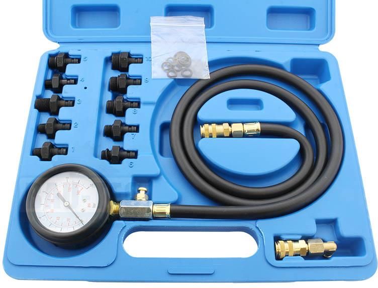 Miernik umożliwia pomiar ciśnienia oleju w silnikach samochodów osobowych i ciężarowych, a także w automatycznych skrzyniach biegów. Miernik wyposażony w gumową osłonę. Całość zestawu w poręcznej walizce ułatwiającej transport i przechowywanie. Cechami charakterystycznymi produktu są wysoka jakość wykonania, długi okres bezawaryjnej eksploatacji oraz łatwość użycia. Zestaw zawiera wiele złączek i adapterów przez co może być stosowany do samochodów różnych marek japońskich, europejskich i amerykańskich. Zestaw może być wykorzystany przy samochodach następujących marek: Acura, Alfa Romeo, Audi, BMW, Chrysler, Daihatsu, Eagle, Fiat, Ford, GM, Geo, Honda, Hyundai, Isuzu, Jeep, Jaguar, Mazda, Mercedes Benz, Mitsubishi, Nissan, Peugeot, Porsche, Renault, Saab, Subaru, Suzuki, Toyota, Volvo Dane techniczne: Zakres pomiarowy: 0-140 PSI/0-10 bar Jednostka na manometrze: PSI i bar Długość węża: 120 cm Ilość adapterów w zestawie: 10