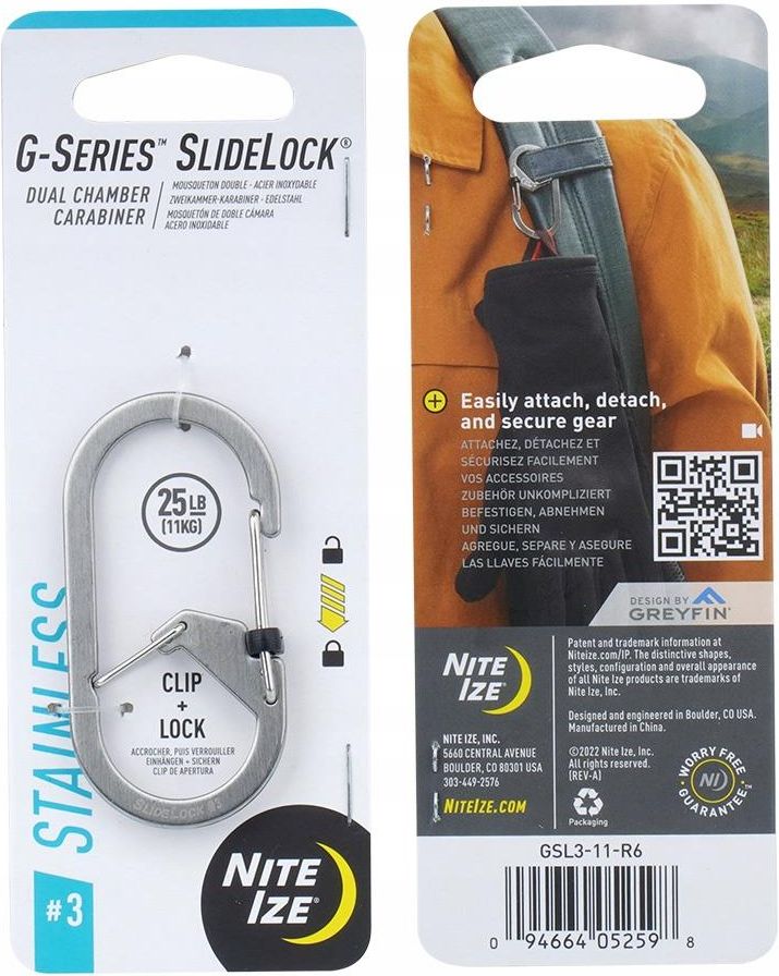 Nite Ize - Karabińczyk G-Series SlideLock #3 - Stalowy Nite Ize Karabińczyk G Series SlideLock #3 wyposażony w dwie komory, które niwelują ryzyko przypadkowego zgubienia przenoszonych kluczy w trakcie przypinania karabińczyka do kluczy. Karabińczyk wykonany ze stali nierdzewnej i wyposażony w …