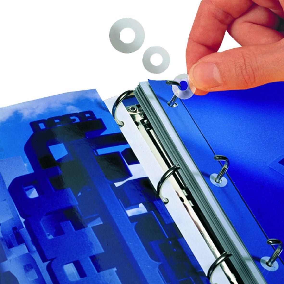 PIERŚCIENIE WZMACNIAJĄCE 3L SAMOPRZYLEPNE BEZBARWNE ŚR.13MM 500 SZT.: Samoprzylepne pierścienie wzmacniające 3L o średnicy 13 mm do zabezpieczenia obszaru wokół perforacji. Chronią nadziurkowane otwory przed skutkami częstego przewracania stron, a także pomagają naprawić te już podarte. Idealne do dokumentów, które muszą być wielokrotnie wyjmowane z segregatorów. Wykonane z przyjaznego dla środowiska tworzywa PP 100 µ z klejem o neutralnym pH. Dostarczane w opakowaniu 500 szt. 8214-500 3L