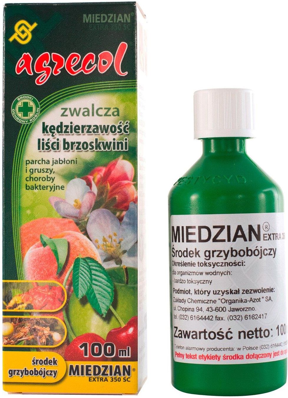 Miedzian Extra 350 SC 100 ml, marki Agrecol.Skoncentrowany środek grzybobójczy w postaci stężonej zawiesiny do rozcieńczania wodą o działaniu kontaktowym.Przeznaczony do stosowania zapobiegawczego w ochronie roślin rolniczych, sadowniczych i warzywnych przed chorobami grzybowymi i bakteryjnymi.Nabycia środków ochrony roślin mogą dokonywać jedynie osoby:a) pełnoletnieb) posiadające kwalifikacje wymagane od osób nabywających środki ochrony roślin określone w art. 28 ustawy o środkach ochrony roślin.