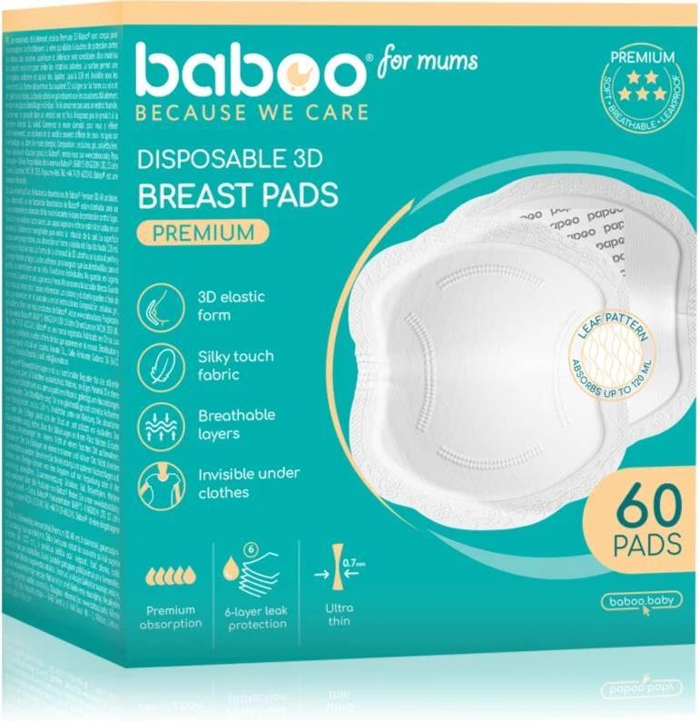 Baboo Ultra-Slim Disposable Pads, 60 szt., Wkładki laktacyjne dla kobiet, W okresie karmienia piersią z pewnością docenisz praktyczność wkładek laktacyjnych Baboo Disposable Breast Pads . Zapewniają one maksymalną dyskrecję i są niezwykle komfortowe w noszeniu. Właściwości: ultra cienkie i profilowane wysoki komfort i wygoda niewidoczne pod ubraniem jednorazowe zapewniają ochronę odzieży przed wyciekającym mlekiem Sposób użycia: Wsuń wkładki do biustonosza, kierując bardziej miękką stronę na brodawki sutkowe. Zmieniaj wkładkę po każdym karmieniu piersią lub jeśli jest mokra.