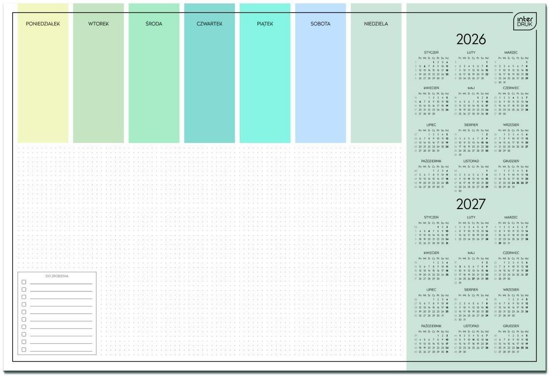 Biuwar na biurko z kalendarzem 2026/2027 – podkładka do notatek i planowania Biuwar na biurko to funkcjonalne akcesorium biurowe, które ułatwia codzienną pracę i organizację czasu. Wyposażony w kalendarz dwuletni obejmujący lata 2026 i 2027, pozwala na szybkie sprawdzenie dat i planowanie wydarzeń w dłuższej perspektywie. Każda z 30 kartek stanowi praktyczną przestrzeń do zapisywania notatek, rysunków czy ważnych informacji, co czyni biuwar wygodnym narzędziem zarówno w pracy biurowej, jak i domowej. Dzięki dużym wymiarom 59 × 40 cm, biuwar pełni również funkcję podkładki na biurko, chroniąc jego powierzchnię przed zabrudzeniami i zarysowaniami. Cechy produktu: biuwar na biurko z kalendarzem dwuletnim 2026/2027, wymiary: 59 × 40 cm, ilość kartek: 30, przeznaczony do zapisywania notatek, szkiców i planów, oryginalny projekt wspierający organizację czasu pracy. Najważniejsze zalety: 2w1 – podkładka na biurko i praktyczny kalendarz, wygodne miejsce na notatki i rysunki, możliwość planowania z wyprzedzeniem na lata 2026–2027, duży format zapewnia komfort użytkowania, estetyczny i funkcjonalny element biura lub domowego stanowiska pracy. Biuwar na biurko z kalendarzem 2026/2027 to praktyczne narzędzie, które łączy funkcję ochrony blatu z możliwością wygodnego planowania i notowania – idealne dla osób ceniących porządek i dobrą organizację czasu.
