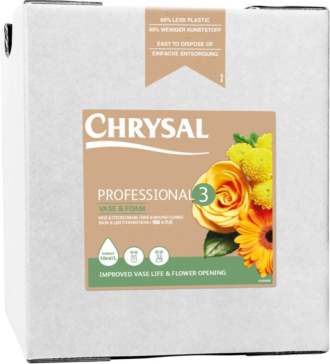 CHRYSAL PROFESSIONAL 3 10 L Bag‑in‑Box – profesjonalna odżywka do kwiatów ciętych w gąbce florystycznej i wazonach. Zapewnia pełne rozwinięcie pąków, świeżość, intensywny kolor i długą trwałość kompozycji. Idealna do gipsówki, goździków, frezji, eustomy i