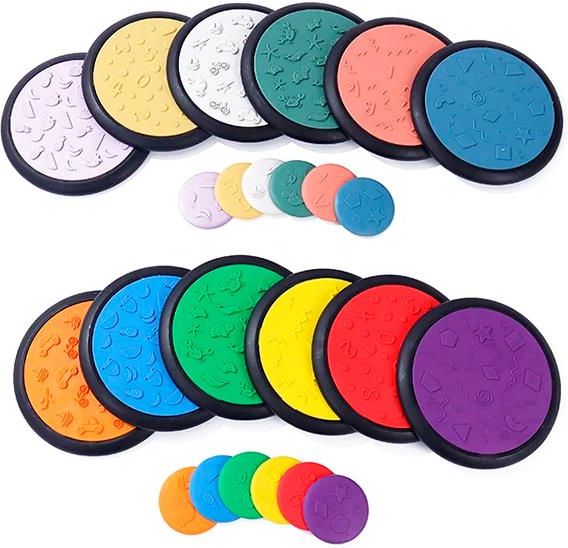 Dyski sensoryczne dotykowe Zabawki sensoryczne tego typu pomagają rozwijać zmysł dotyku i zdolności motoryczne poprzez interaktywną zabawę, zachęcając dzieci do eksploracji i uczenia się w przyjaznym środowisku. ELEMENTY ZESTAWU dyski sensoryczne duże - 12 szt. dyski sensoryczne małe - 12 szt. Szczegóły Produktu Materiał: Plastik PP/TPE Zakres wiekowy: 12 miesiące + Wymiary: Duży: Średnica 27 cm; Mały: Średnica 13 cm Waga brutto: 4.85 kg Certyfikaty: EN71, ASTM, SOR, BSEN71