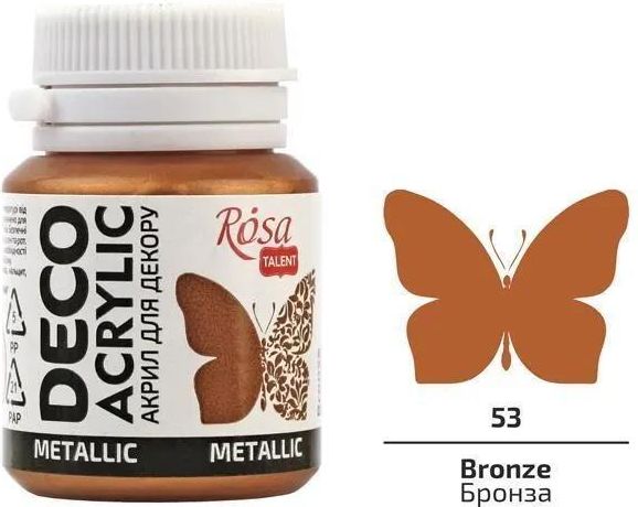 FARBA AKRYLOWA Do MALOWANIA Szkolna Farba Akryl metaliczna bronze Brązowa Producent: Rosa Farby akrylowe metaliczne przeznaczone do dekoracji. Doskonale sprawdzają się w większości technik hobbystycznych, w tym decoupage, cracklingu, scrapbookingu, czy malarstwie dekoracyjnym. Można je nakładać na: drewno, sklejkę, płytę pilśniową, MDF, papier, tekturę, zagruntowane płótno, kamień lub cegłę. Wyróżniają się bogatymi kolorami, silną przyczepnością do podłoża i szybkim czasem schnięcia. Kremowa konsystencja farb zapewnia łatwe i gładkie rozprowadzanie pędzlem. Farby można rozcieńczać wodą lub mieszać ze sobą w celu uzyskania nowych odcieni. Po wyschnięciu tworzą wodoodporną, nieprzezroczystą powłokę dzięki czemu, ozdobione nimi przedmioty mogą być używane w gospodarstwie domowym. Kolory metaliczne stają się mniej błyszczące po nałożeniu lakieru nawierzchniowego. Dostępne na sztuki w plastikowych słoiczkach o pojemności 20 ml.