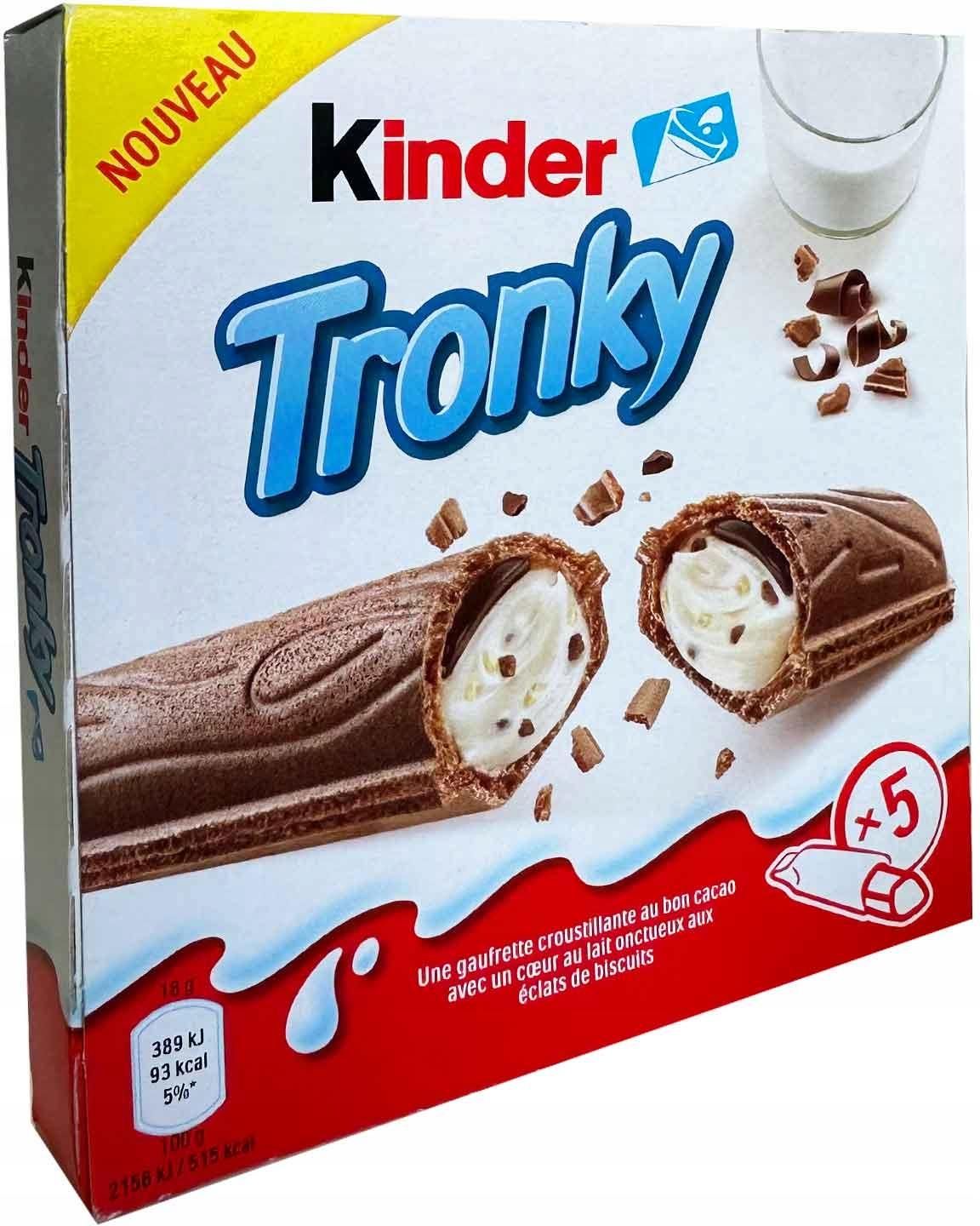 6szt Kinder Tronky Wafelek z Mlecznym Nadzieniem Batonik 18g Poczuj chrupiący relaks z każdym kęsem Kinder Tronky to wyjątkowa propozycja dla tych, którzy cenią połączenie chrupiących wafli, delikatnego nadzienia mleczno-kakaowego i kremowej warstwy czekolady. Idealne na chwilę słodkiej przyjemności – codziennie, między posiłkami, albo jako mała nagroda po dniu pełnym wyzwań. Skład: Odtłuszczone mleko w proszku 21%, cukier, olej palmowy, mąka pszenna 19%, czekolada mleczna 15% (cukier, mleko w proszku, tłuszcz kakaowy, miazga kakaowa, emulgatory (lecytyny sojowa), wanilina), masło (z mleka), chude kakao w proszku 1,1%. , orzechy laskowe, skrobia pszenna, emulgatory (lecytyny [sojowe]), proszek do pieczenia (kwaśny węglan sodu, kwaśny węglan amonu), sól, śmietanka w proszku (z mleka), serwatka w proszku (z mleka), wanilina. Batoniki łączą w sobie wyszukane smaki z pełnym aromatem mlecznej czekolady, kremową i aksamitną nutą nadzienia oraz chrupiącym waflem. To prawdziwa uczta dla podniebienia! Przechowywanie i użytkowanie Przechowywać w suchym miejscu, w temperaturze pokojowej, z dala od źródeł wilgoci i zapachów Po otwarciu zachować szczelność opakowania, by wafle nie straciły chrupkości Produkt gotowy do spożycia, idealny jako szybka przekąska Zastosowania — idealny kiedy… Masz ochotę na coś słodkiego po obiedzie lub jako przekąska do kawy Potrzebujesz czegoś poręcznego na wyjazd, do plecaka albo jako łakoci do lunchboxu Chcesz zaskoczyć dzieci — uroczy pomysł jako dodatek do deserów lub na urodzinową imprezę Szukasz czegoś kremowego i chrupiącego na wieczorny relaks Dla kogo? Dla miłośników słodyczy lubiących krem-wafelek i mleczną czekoladę Dla osób, które czasem chcą się oderwać od codzienności i sięgnąć po smakową przyjemność Dla dzieci (oczywiście przy umiarkowanym spożyciu) — Kinder to marka rozpoznawalna i lubiana przez najmłodszych Dla tych, którzy cenią produkty renomowanej marki i smak premium Szczegóły produktu: Marka: Ferrero Kinder Produkt: Tronky Smak: Kakaowo-mleczny Waga jednostkowa: 18 g Ilość w zestawie: 48 sztuk Konsystencja: Chrupiący wafel z delikatnym nadzieniem Idealny dla: dzieci, dorosłych, do szkoły, pracy, na wycieczki Pyszna, wygodna i zawsze gotowa do dzielenia – Kinder Tronky to mała radość na każdy dzień! Alergeny: ZAWIERA MLEKO, PSZENICĘ (GLUTEN), SOJĘ, ORZECHY LASKOWE. MOŻE ZAWIERAĆ ŚLADOWE ILOŚCI JĘCZMIEŃA Wartości odżywcze w 100 g: zawierają około 2 156 kJ (515 kcal) energii, 27 g tłuszczu, w tym 13,4 g tłuszczów nasyconych, 56,6 g węglowodanów, w tym 40,9 g cukrów, 10,8 g białka oraz 0,50 g soli
