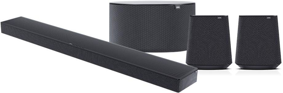 Zestaw składający się z soundbara Loewe klang bar5 mr, subwoofera Loewe sub5 oraz dwóch głośników klang mr1